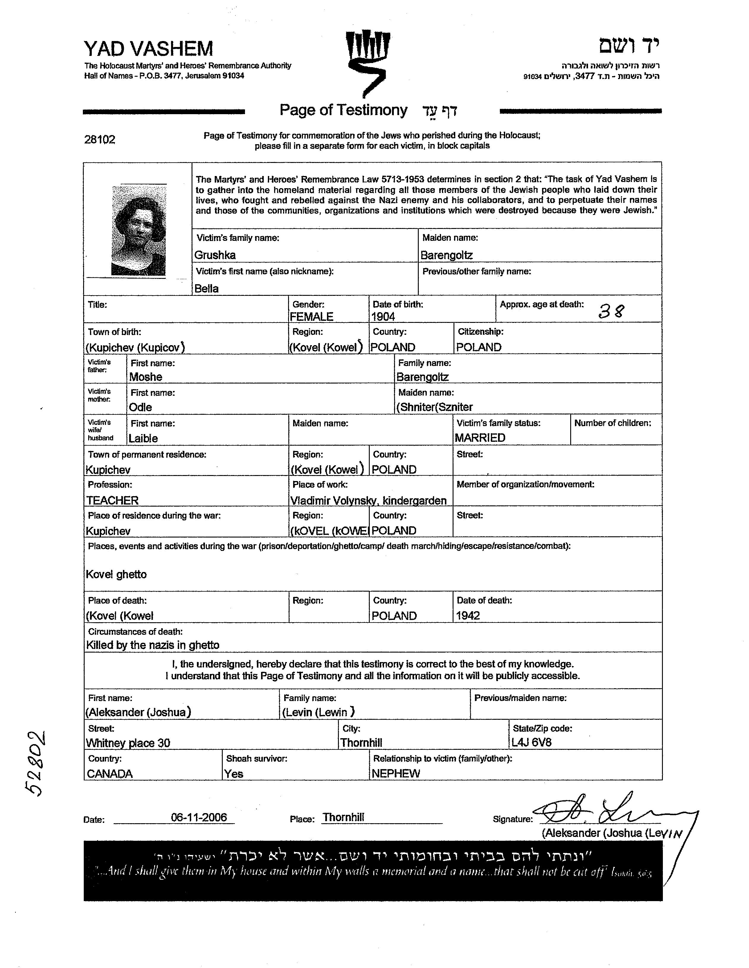 Bella Grushka nee Barengoltz was born in Kupiczow, Poland, 1904. She was a teacher. Prior to WWII she lived in Kupiczow, Poland. Bella was murdered in the Shoah. Place of death: Kowel, Poland, 1942.