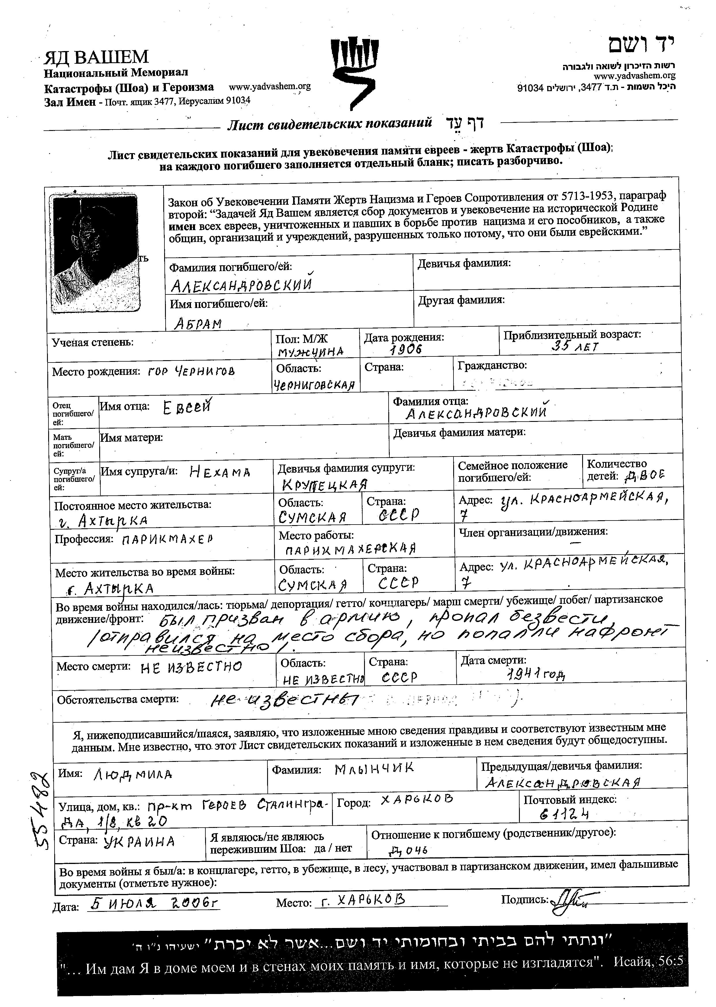 Abram Aleksandrovski was born in Chernigov, Ukraine (USSR), 1906. He was a hairdresser. Prior to WWII he lived in Akhtyrka, Ukraine (USSR). Abram was killed in military service in WWII. Place of death: unstated place.