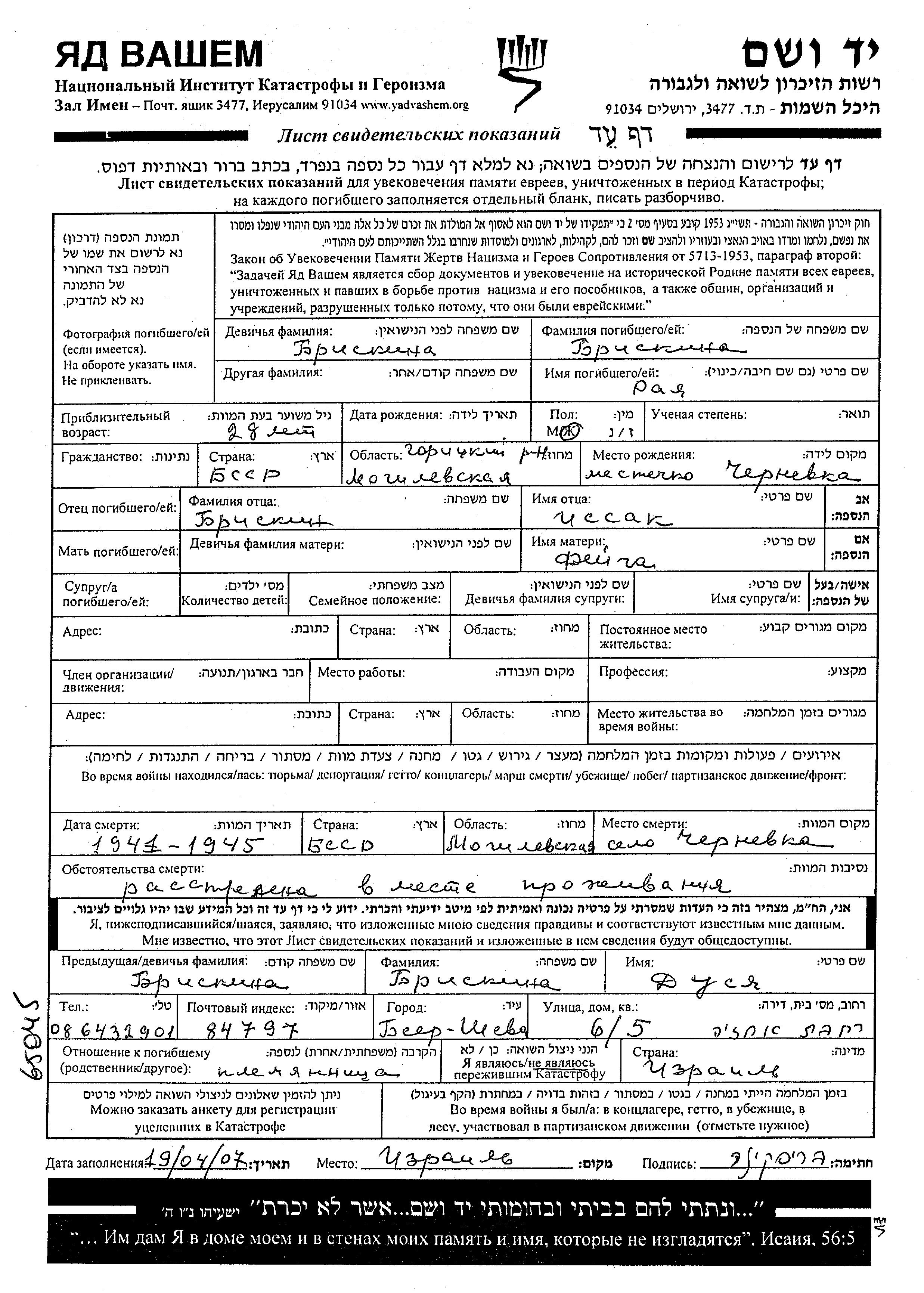 Raya Briskina was born in Chernevka, Belorussia (USSR). Prior to WWII he lived in Chernevka, Belorussia (USSR). Raya was murdered in the Shoah. Place of death: Chernevka, Belorussia (USSR).
