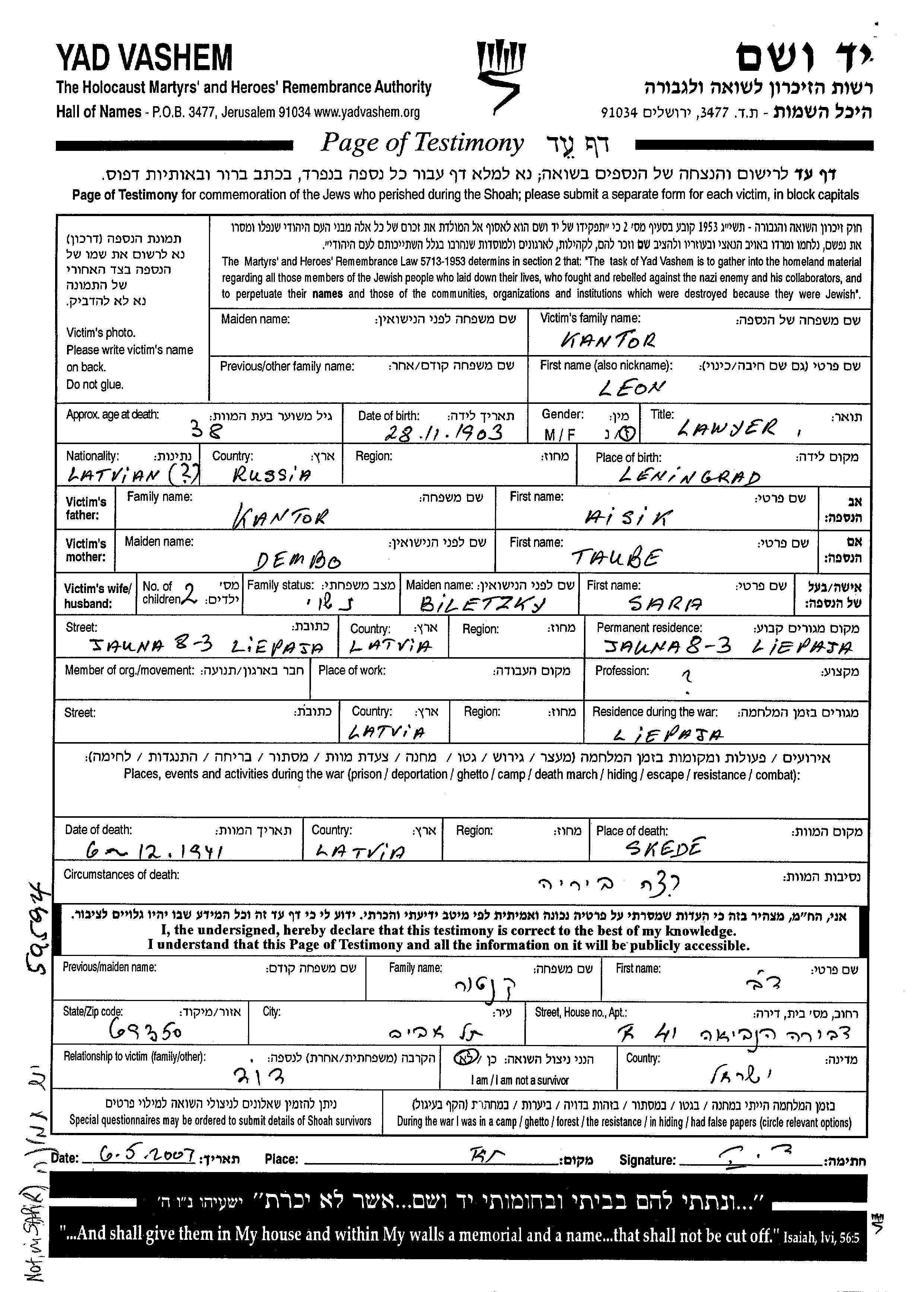| Kantor | Leon | 1903 | Liepaja, Latvia | Page of Testimony |