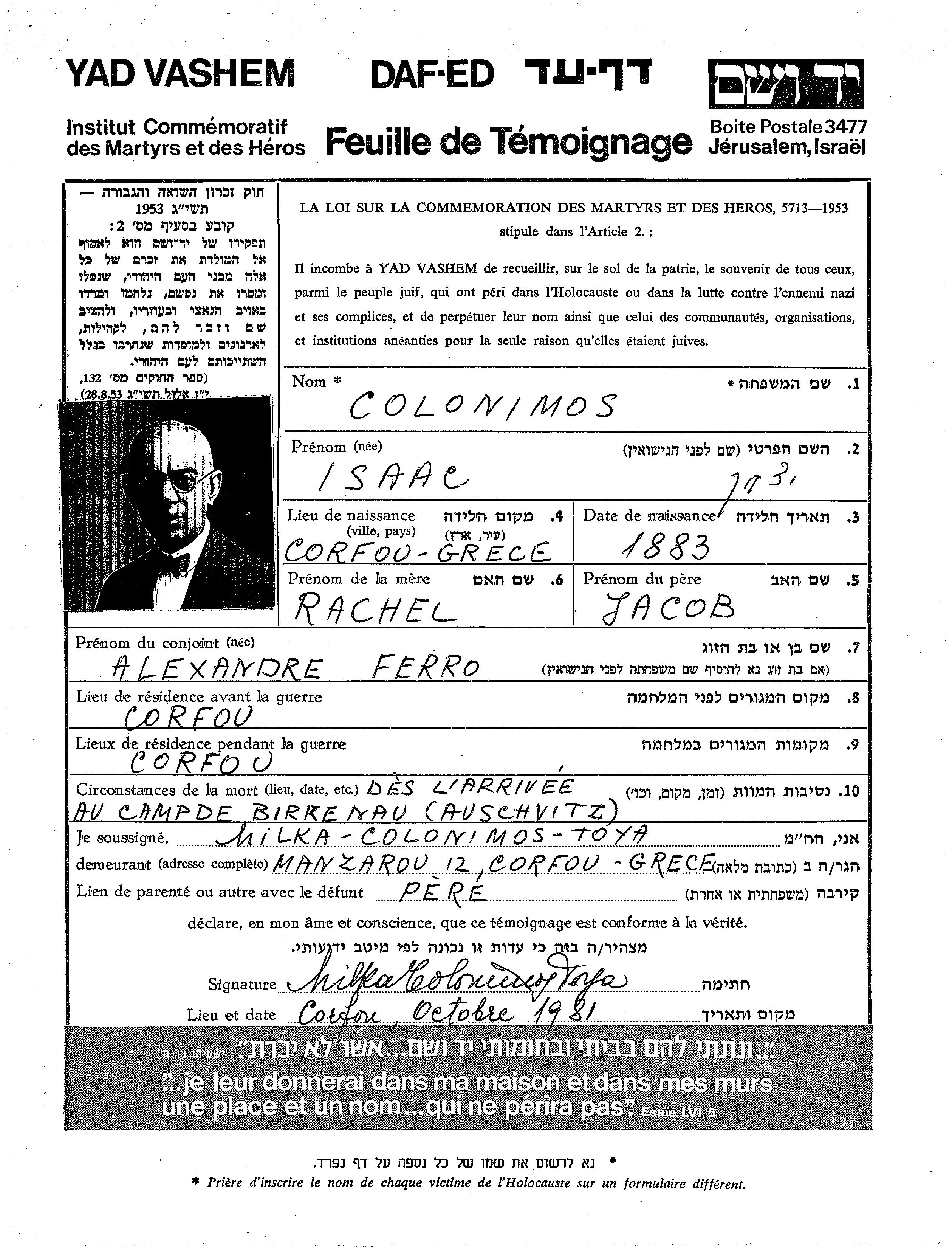 Isaac Colonimos was born in Kerkyra, Greece, 1883. Prior to WWII he lived in Kerkyra, Greece.
