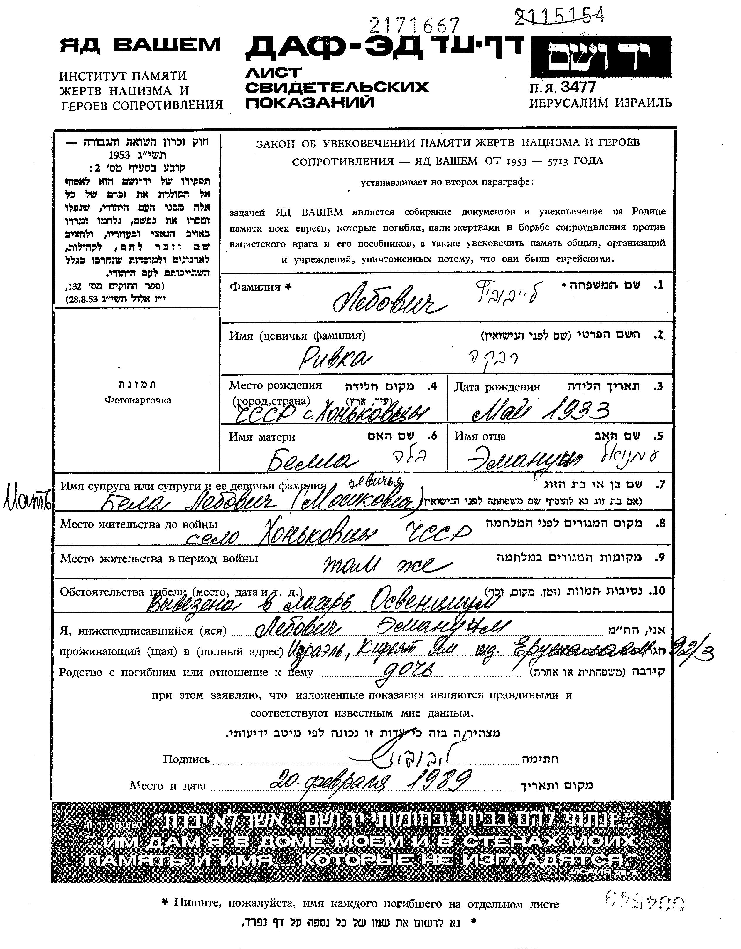 Lebovich Rivka 1933 Chonkovce, Czechoslovakia Page of Testimony