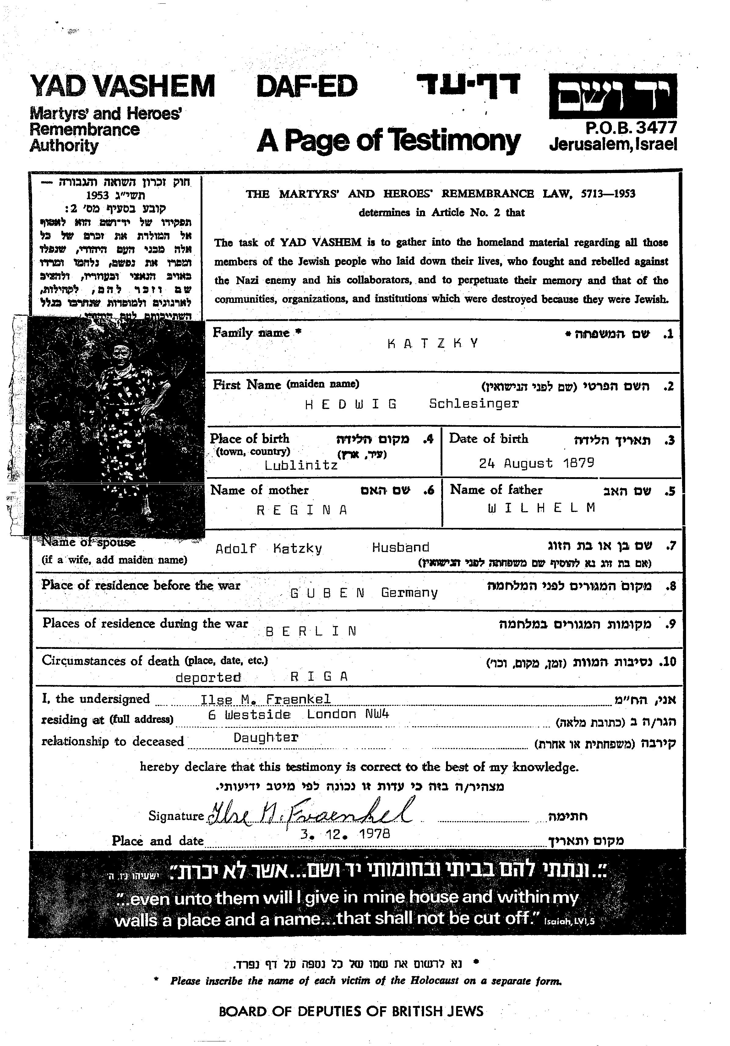 Katzky Hedwig 1879 Guben, Germany Page of Testimony