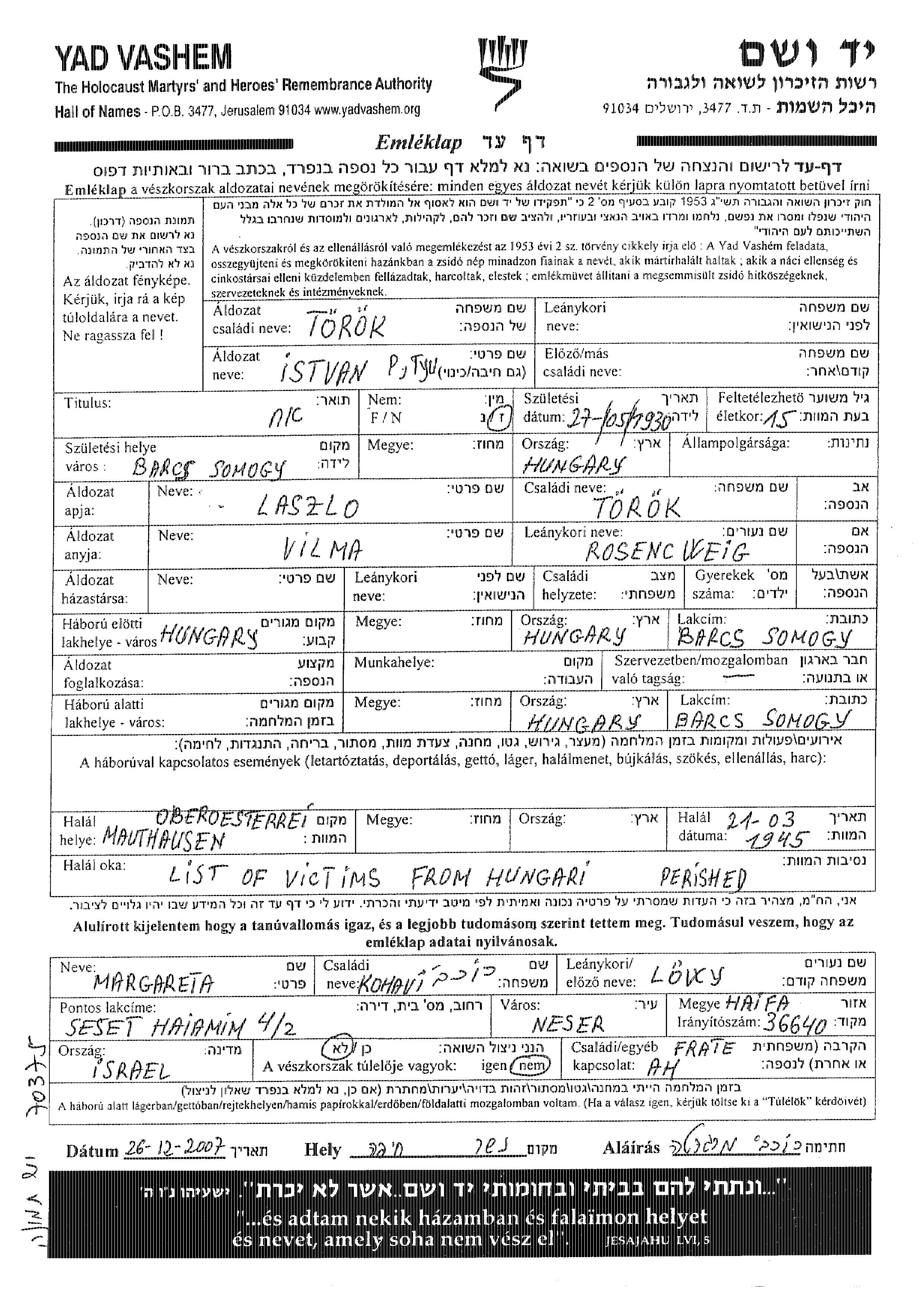 Torok Istvan 1930 Barcs, Hungary Page of Testimony
