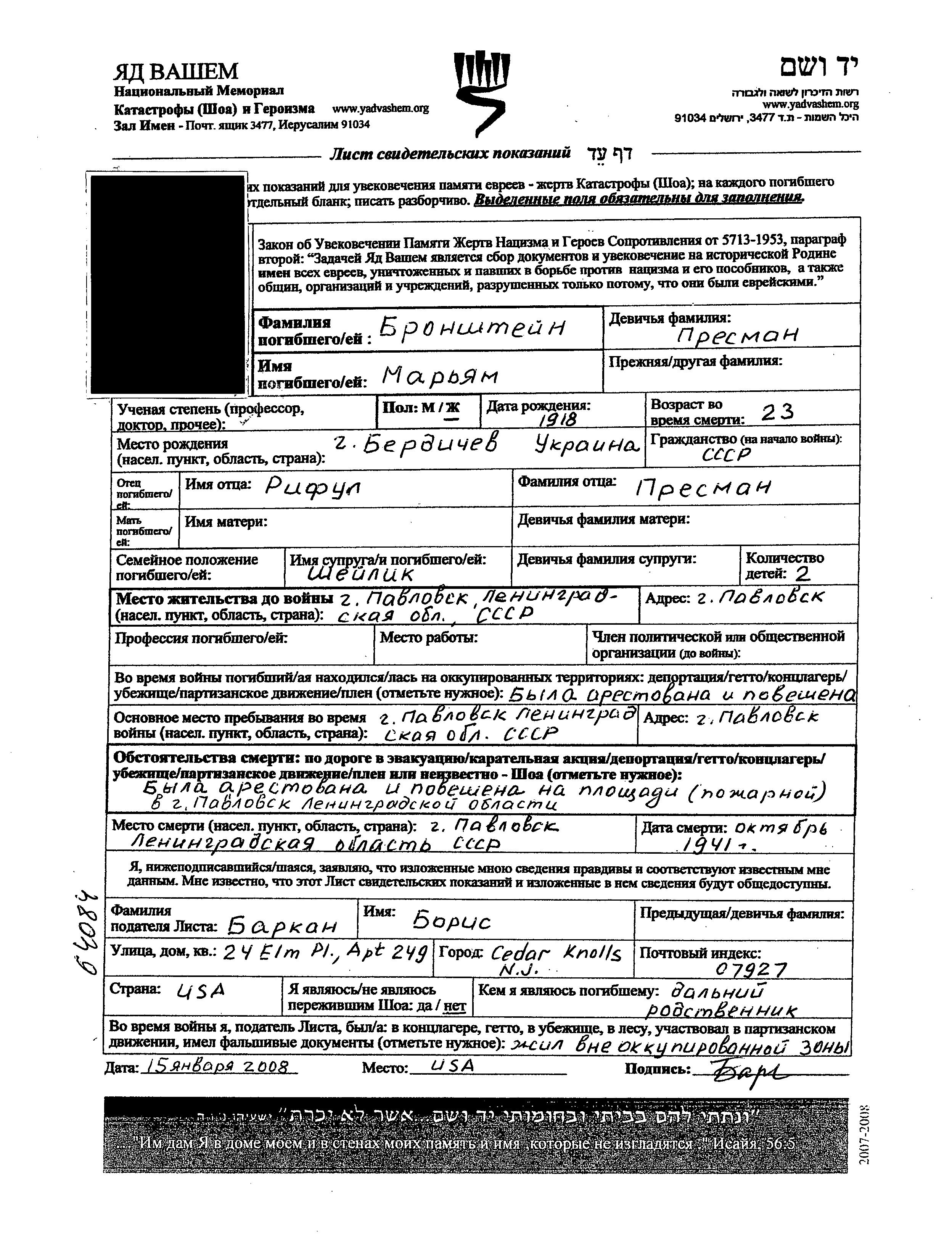 Bronshteyn Mariam 1918 Pavlovsk, Russia (USSR) Page of Testimony