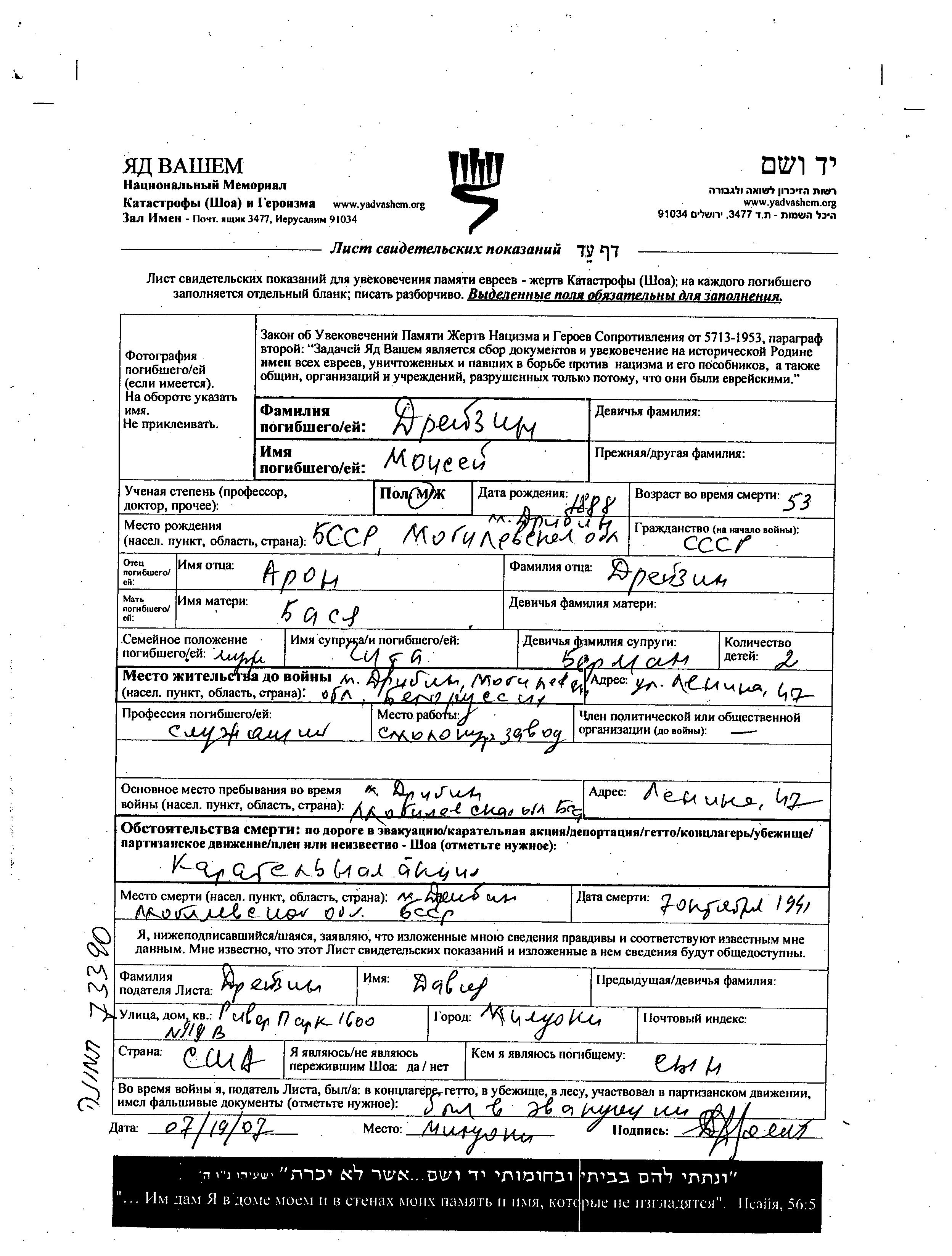 Dreyzin | Moisey | 1888 | Dribin, Belorussia (USSR) | Page of Testimony |