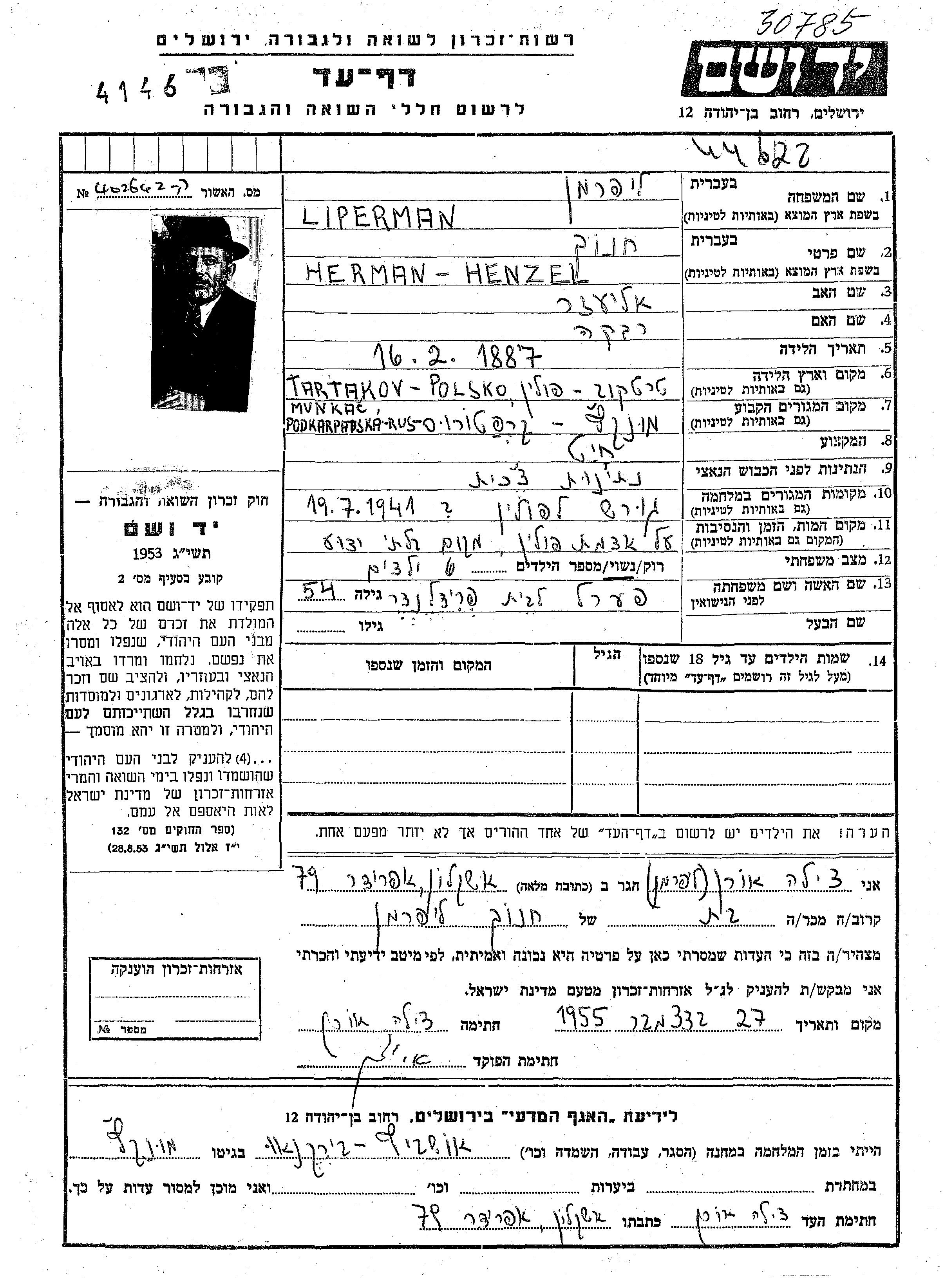 Khanokh Herman Henzel Liperman was born in Tartaków Miasto, Poland, 1887. He was a tailor. Prior to WWII he lived in Mukačevo, Czechoslovakia. Khanokh Herman Henzel was murdered in the Shoah. Place of death: Poland, 19/07/1941.
