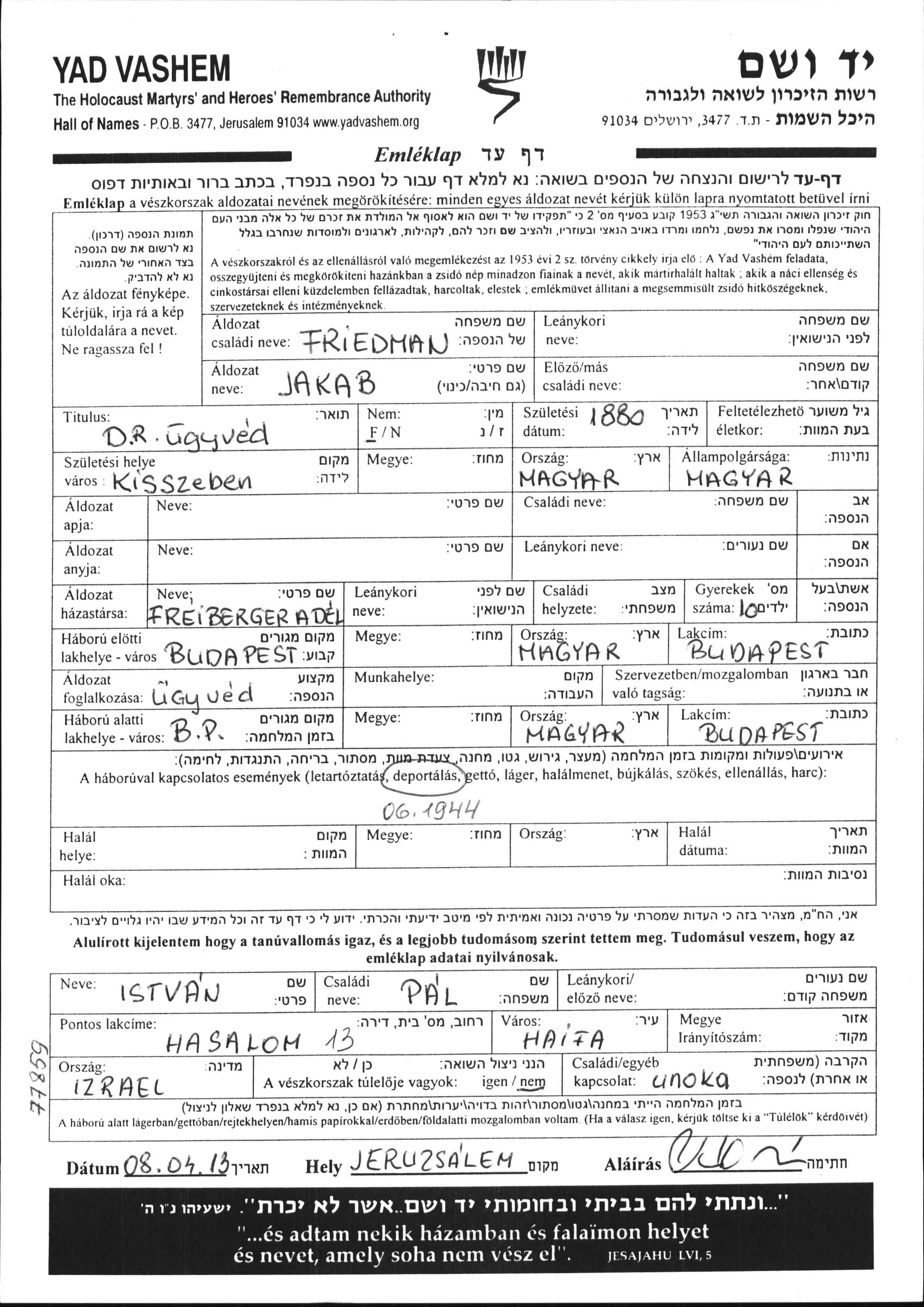 Jakab Friedman was born in Sabinov, Czechoslovakia, 1880. He was a lawyer. Prior to WWII he lived in Budapest, Hungary.