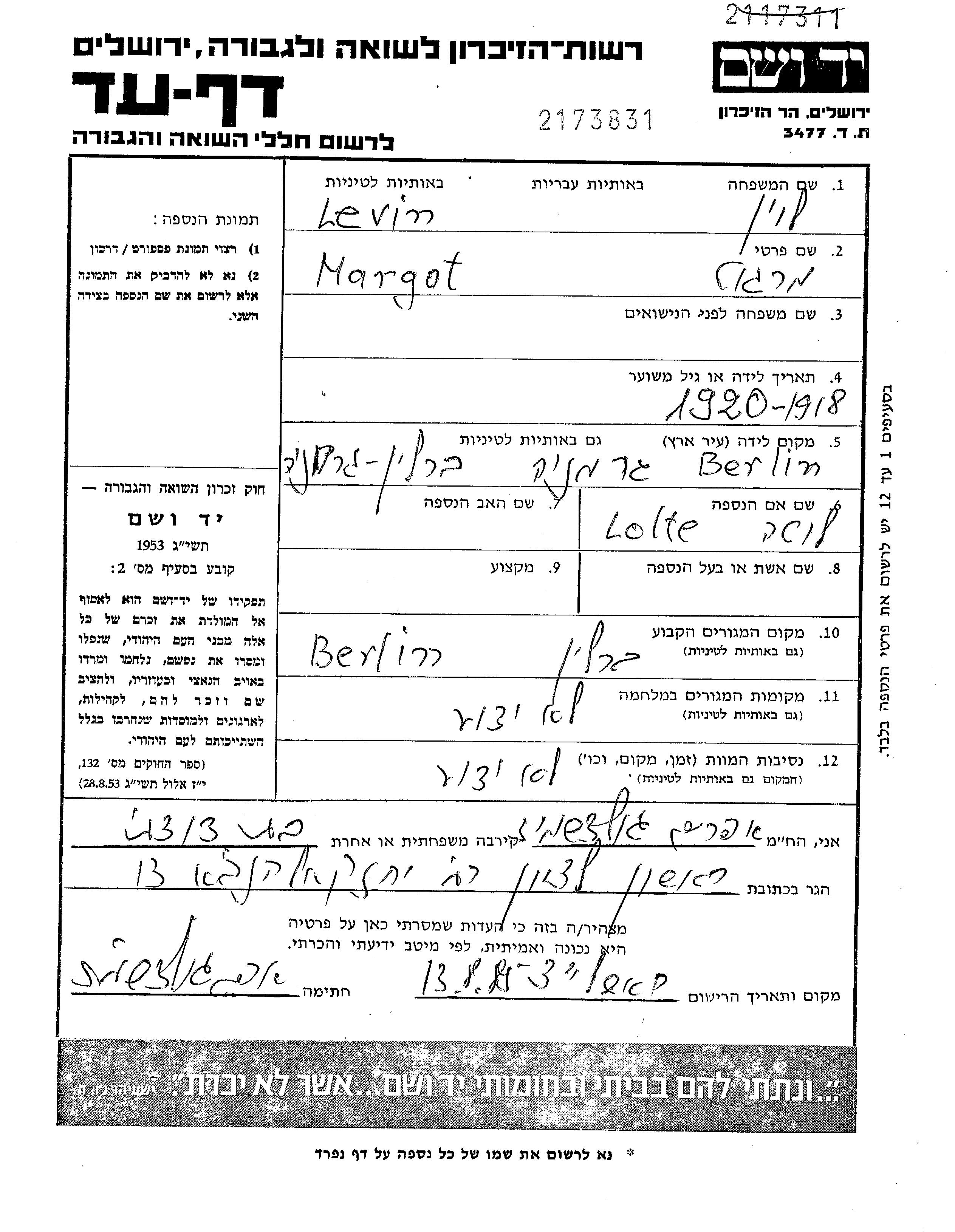 Levin Margot 1919 Berlin, Germany Page of Testimony