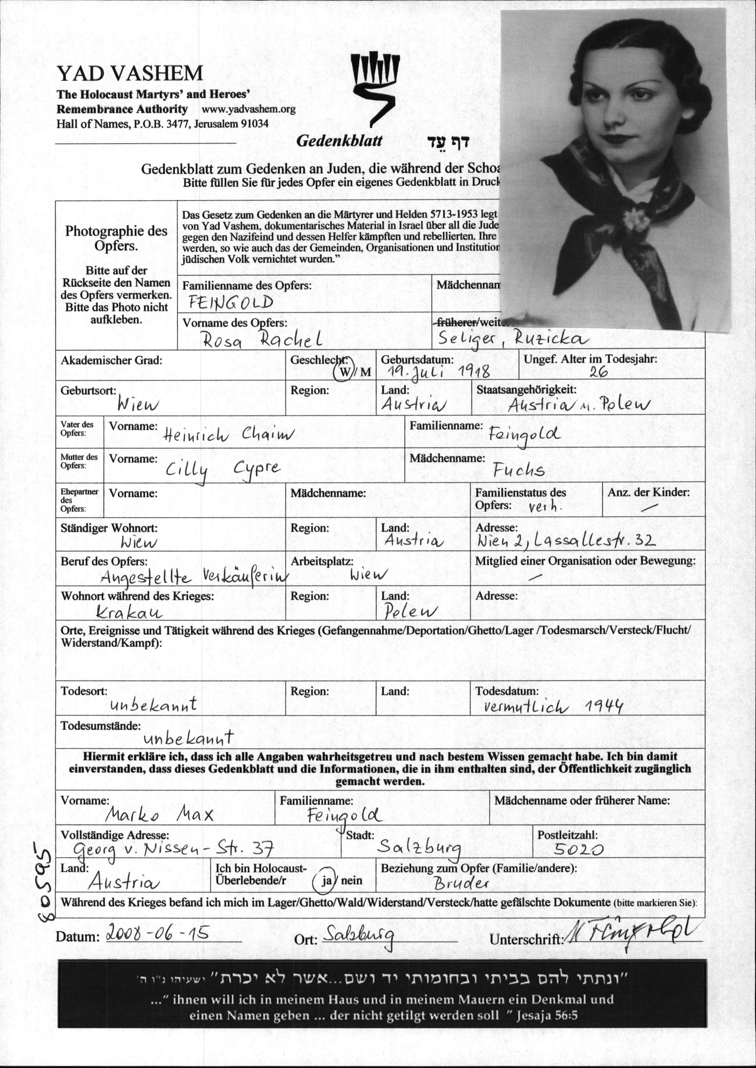 Seliger Rosa Rachel 1918 Wien, Austria Page of Testimony
