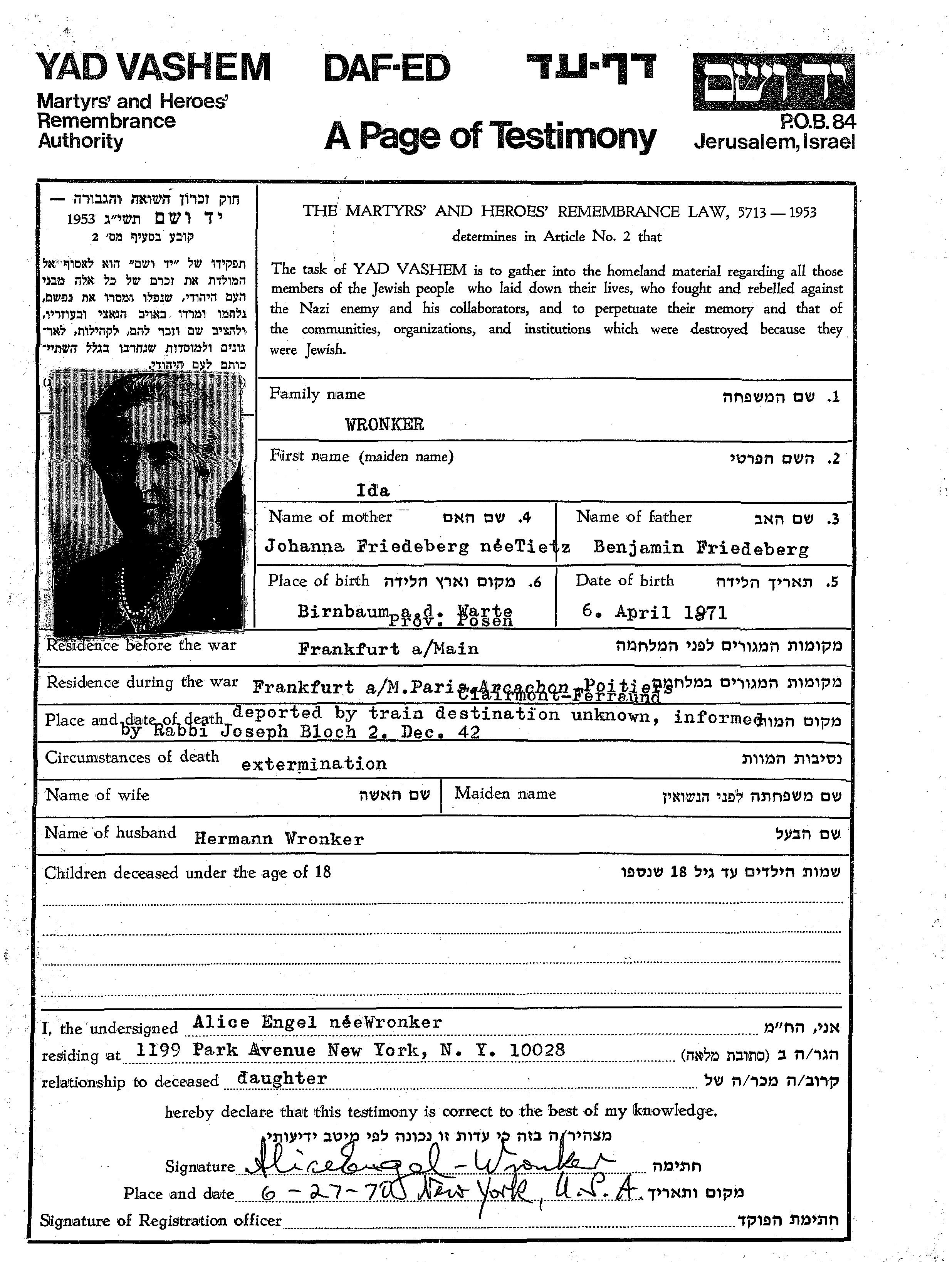 Ida Wronker nee Friedberg was born in Miedzychod, Poland, 1871. Prior to WWII she lived in Frankfurt, Germany. Ida was murdered in the Shoah. Place of death: unstated place, 02/12/1942.