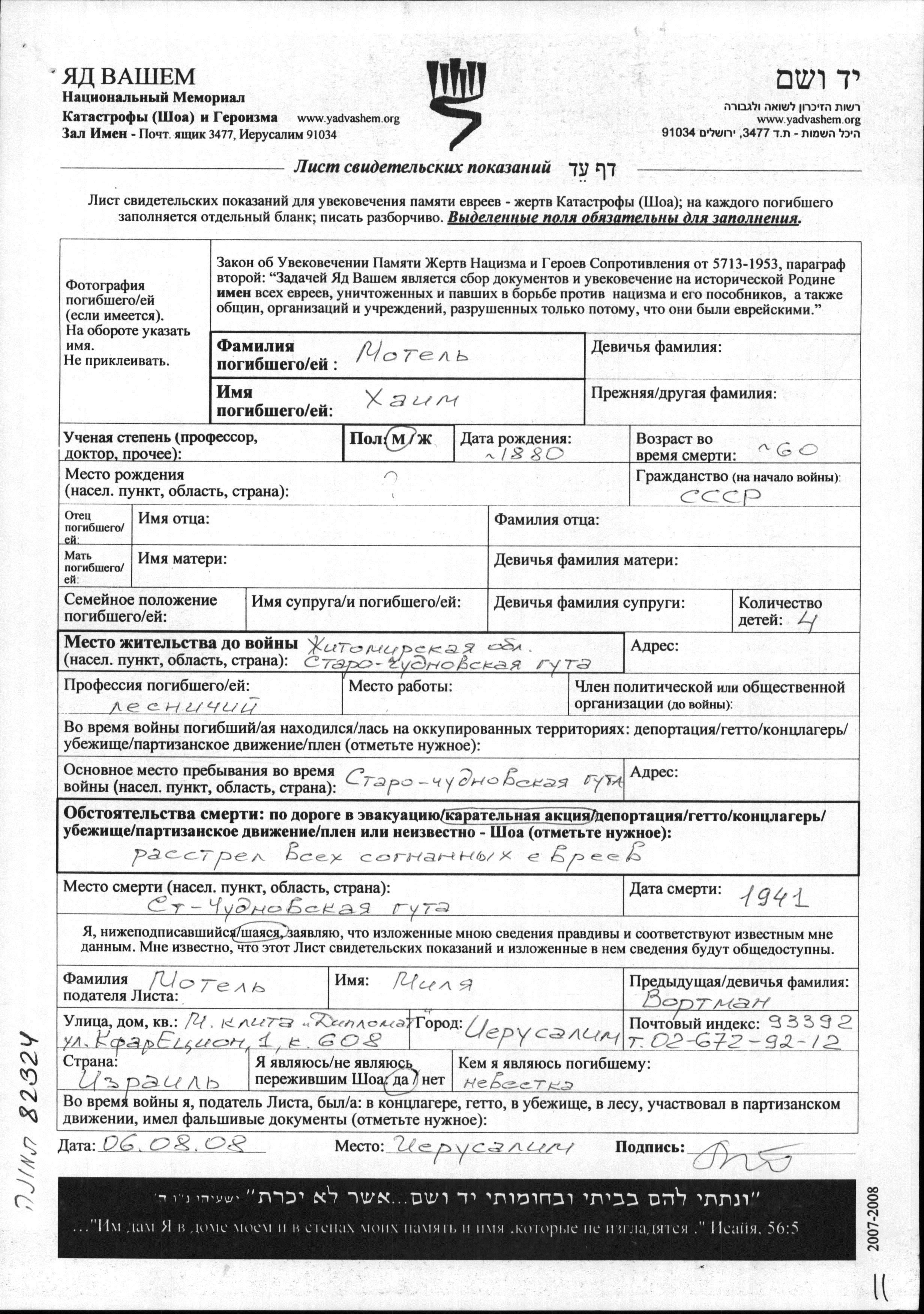 Khaim Motel was born, 1880. He was a lesnichy. Prior to WWII he lived in Starochudnovskaya Guta, Ukraine (USSR). Khaim was murdered in the Shoah. Place of death: Starochudnovskaya Guta, Ukraine (USSR), 1941.