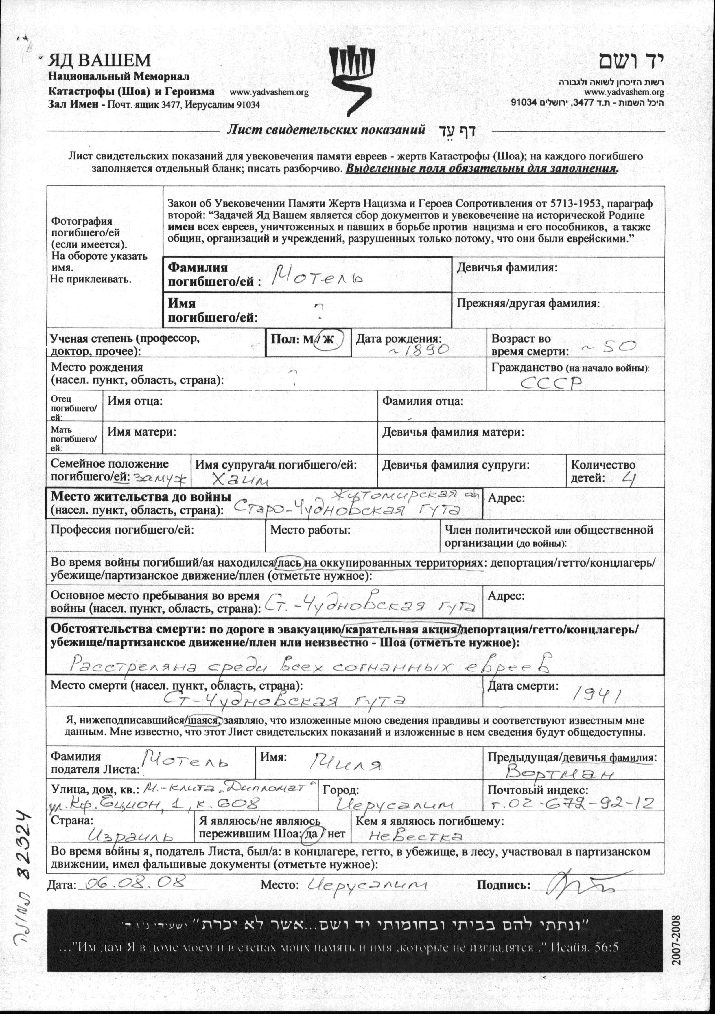 First name unknown Motel was born in Soviet Union, 1891. Prior to WWII she lived in Starochudnovskaya Guta, Ukraine (USSR). She was murdered in the Shoah. Place of death: Starochudnovskaya Guta, Ukraine (USSR), 1941.