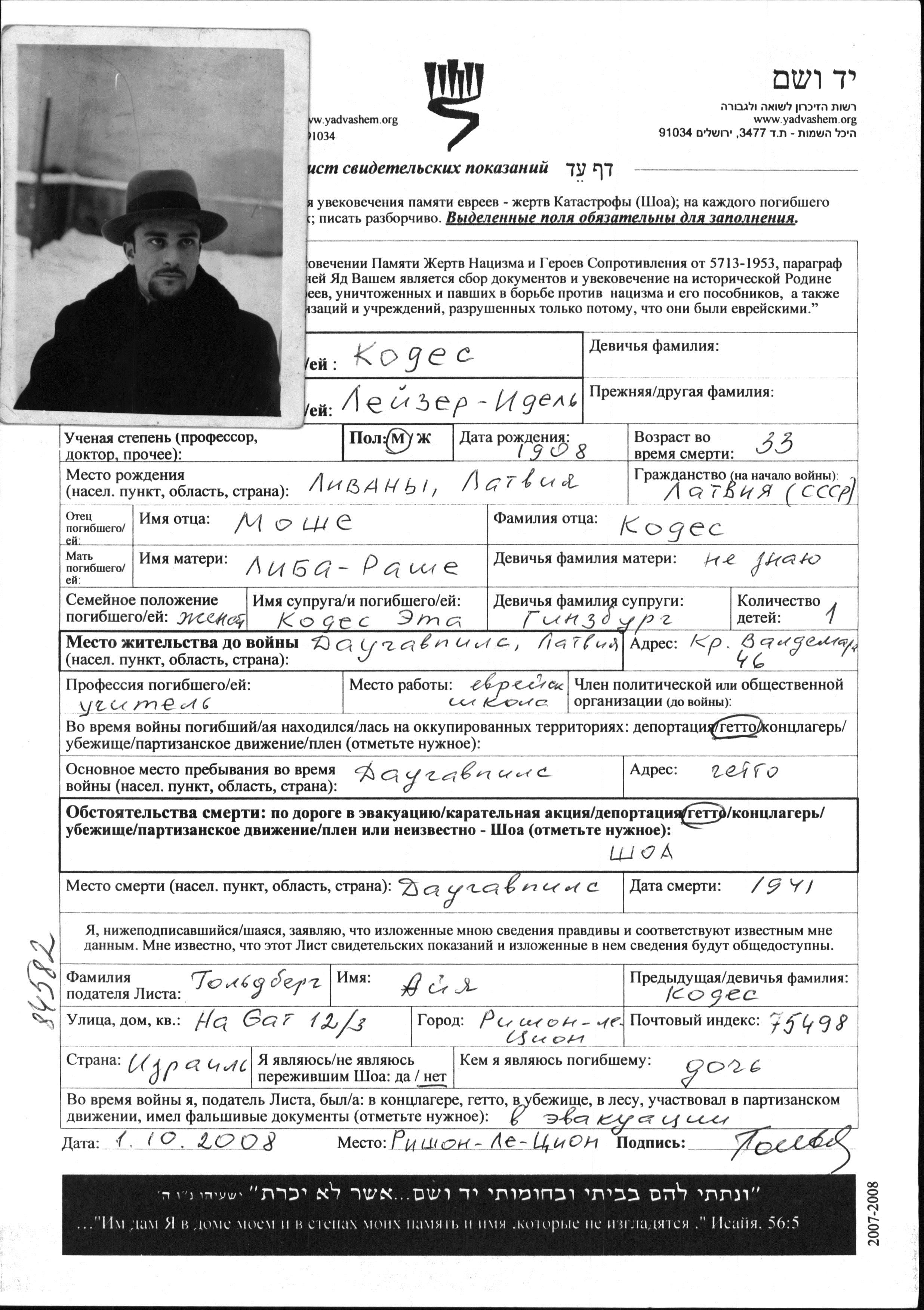 Lejzer Idel Kodes was born in Livani, Latvia, 1908. He was a teacher. Prior to WWII he lived in Daugavpils, Latvia. Lejzer Idel was murdered in the Shoah. Place of death: Daugavpils, Latvia, 1941.