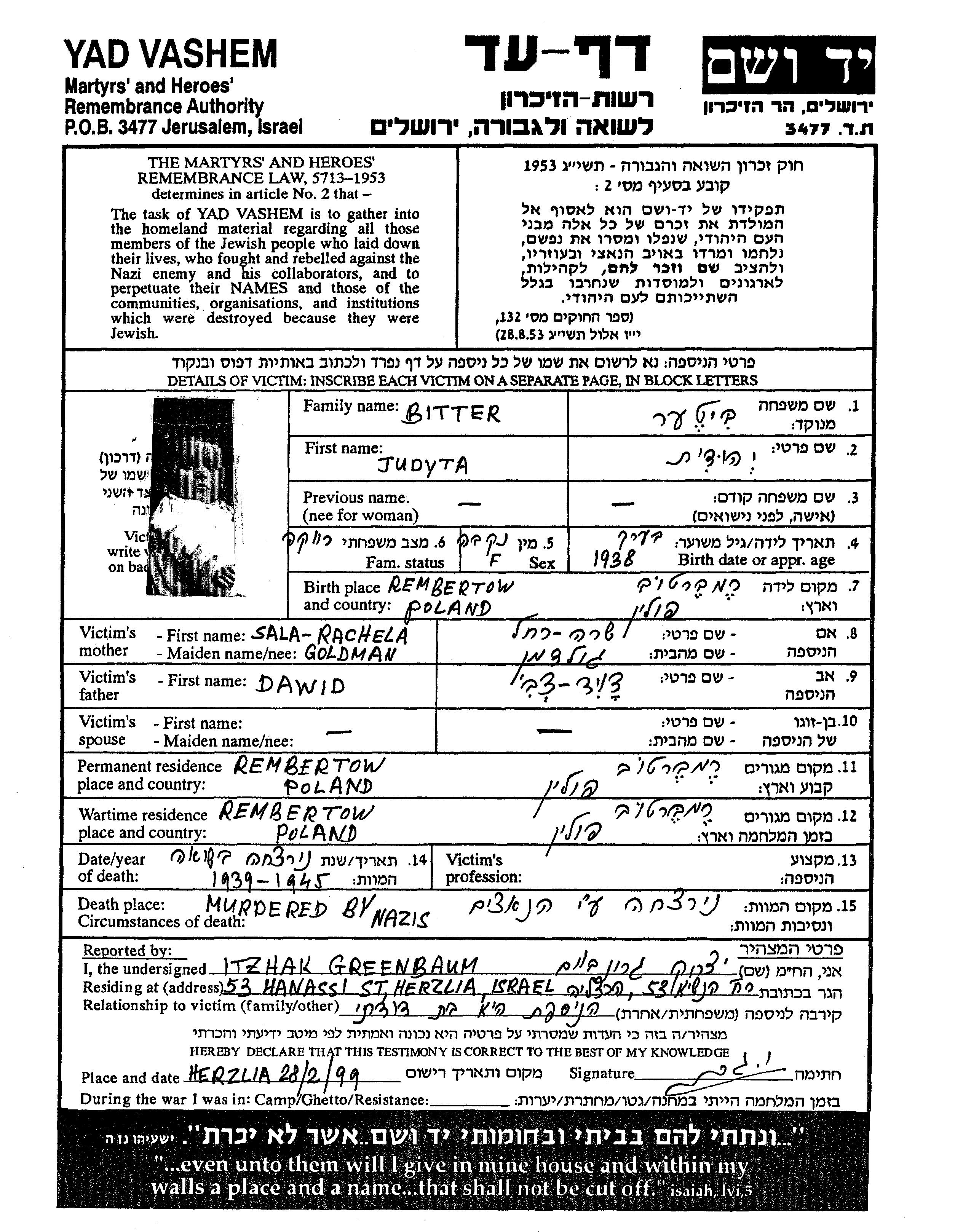 Bitter Yehudit Rembertow, Poland Page of Testimony