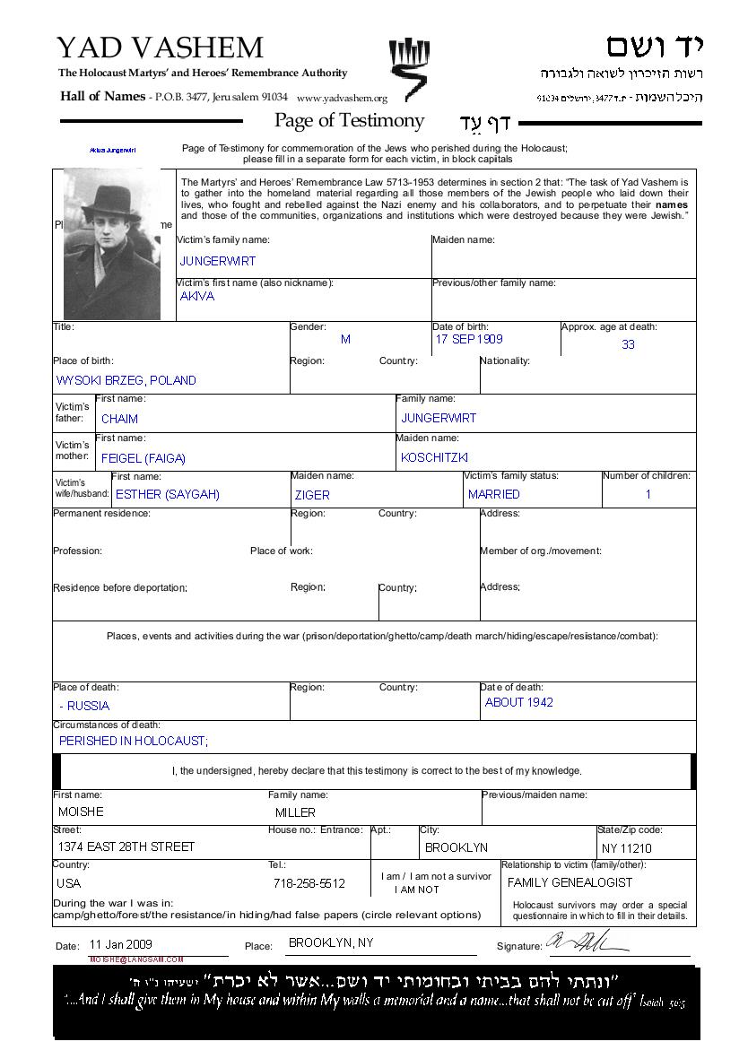 Jungerwirt Akiva 1909 Poland Page of Testimony (digital)