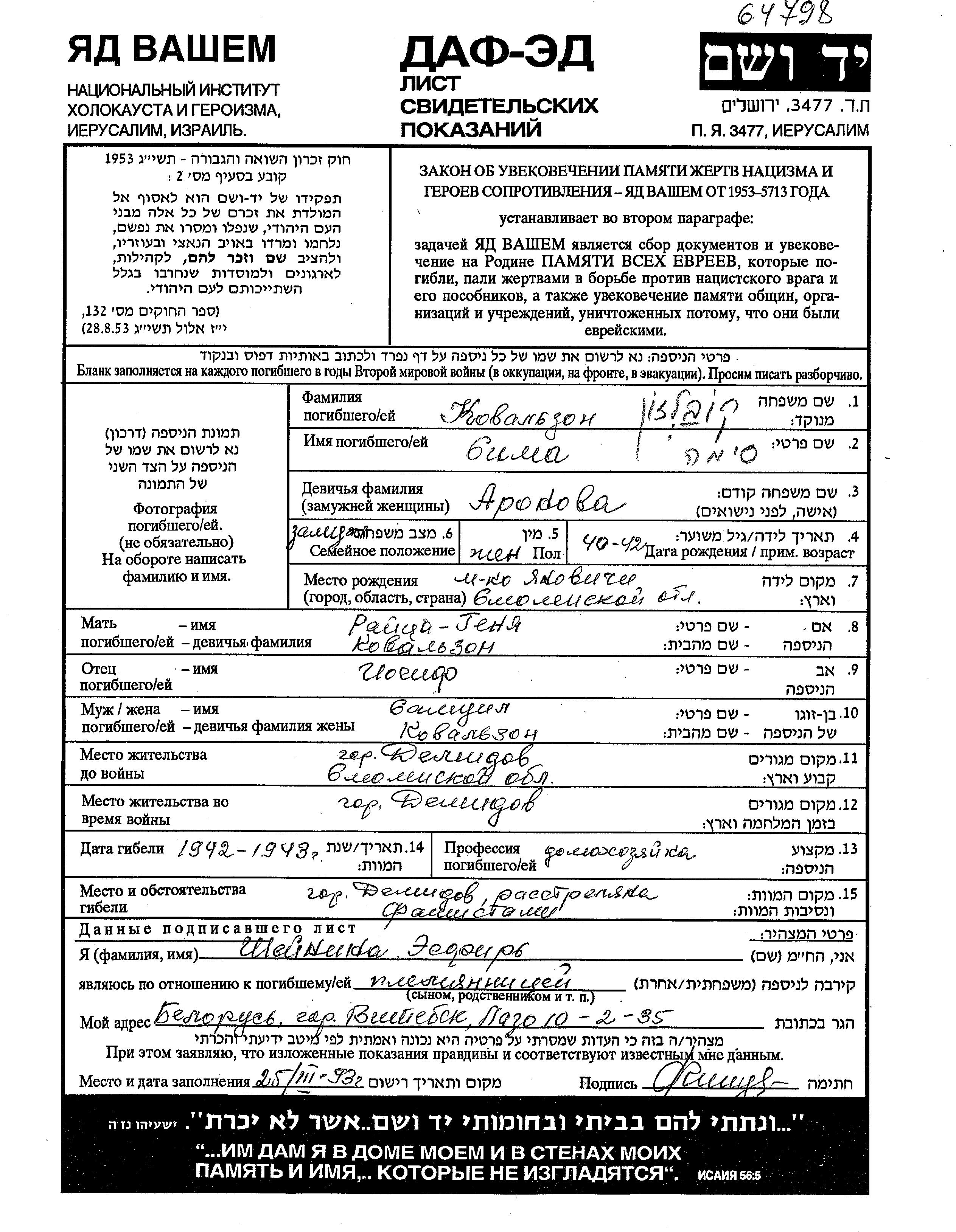 Sima Kovalzon nee Aronov was born in Yanovichi, Belorussia (USSR) to Iosif and Raitza Genia nee Kovalzon. She was a housewife and married to Samuil. Prior to WWII she lived in Demidov, Russia (USSR). During the war she was in Demidov, Russia (USSR). Sima was murdered in the Shoah. Place of death: Demidov, Russia (USSR), 1942.