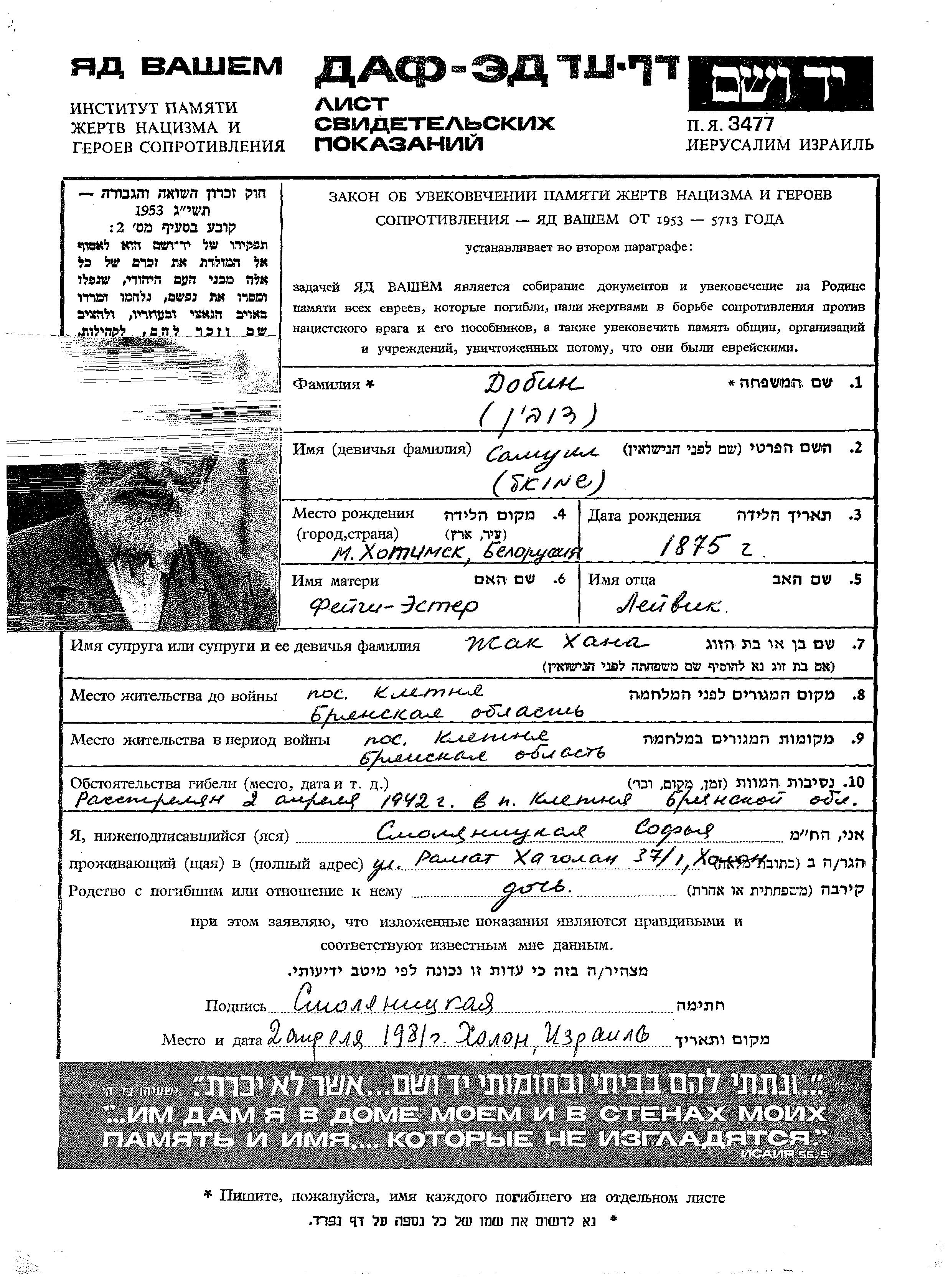 Samuil Dobin was born in Khotimsk, Belorussia (USSR), 1875. Prior to WWII he lived in Kletnya, Russia (USSR). Samuil was murdered in the Shoah. Place of death: Kletnya, Russia (USSR), 02/04/1942.