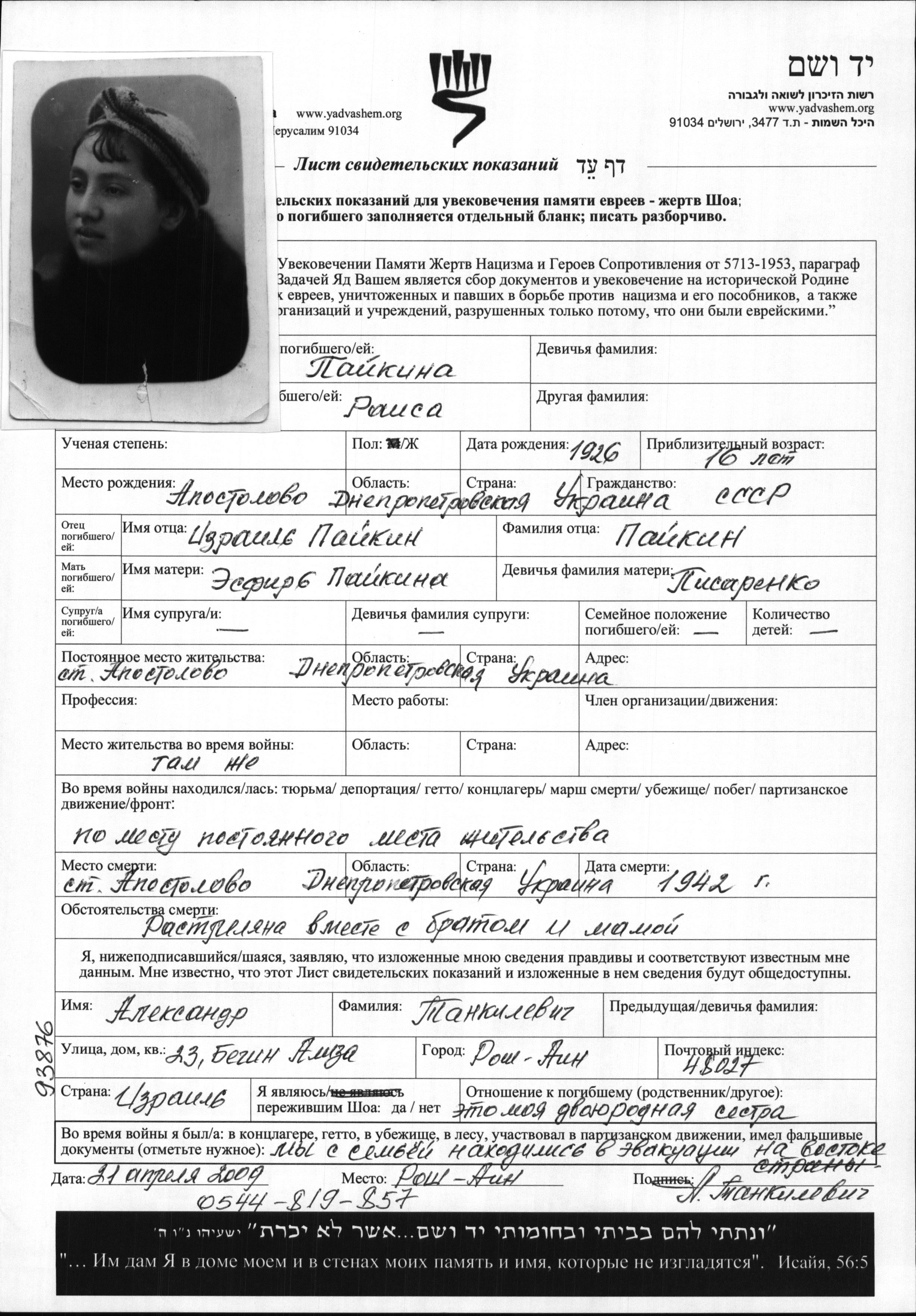 Raisa Paykina was born in Apostolovo, Ukraine (USSR), 1926. Prior to WWII she lived in Apostolovo, Ukraine (USSR). Raisa was murdered in the Shoah. Place of death: Apostolovo, Ukraine (USSR), 1942.