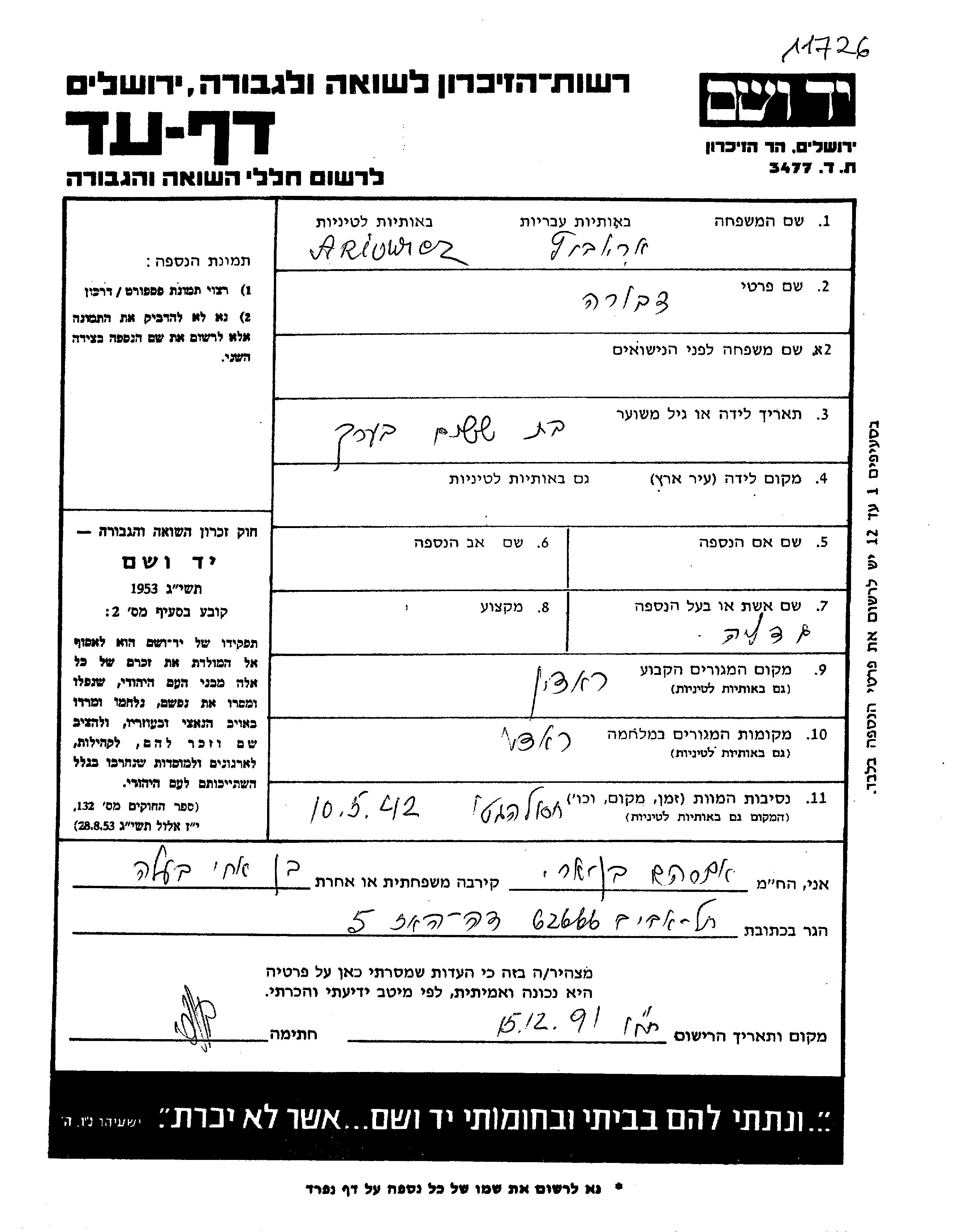 Dvora Ariowicz was born, 1882. She was married to Gedalia. Prior to WWII she lived in Radun, Poland. During the war she was in Radun, Poland. Dvora was murdered in the Shoah. Place of death: Radun, Poland, 10/05/1942.