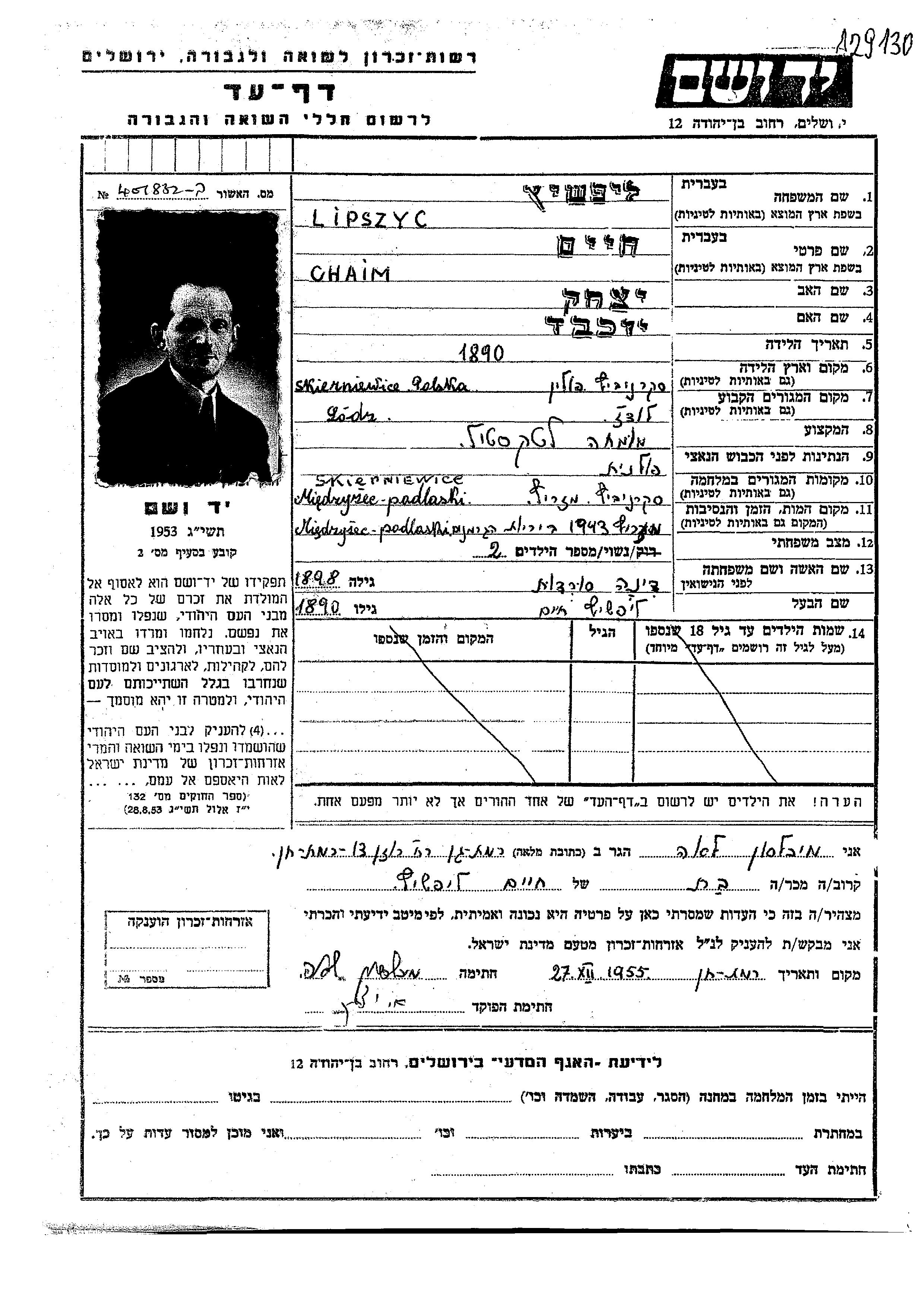 Chaim Lipszyc was born in Skierniewice, Poland, 1890. He was a textile expert. Prior to WWII he lived in Łódź, Poland.