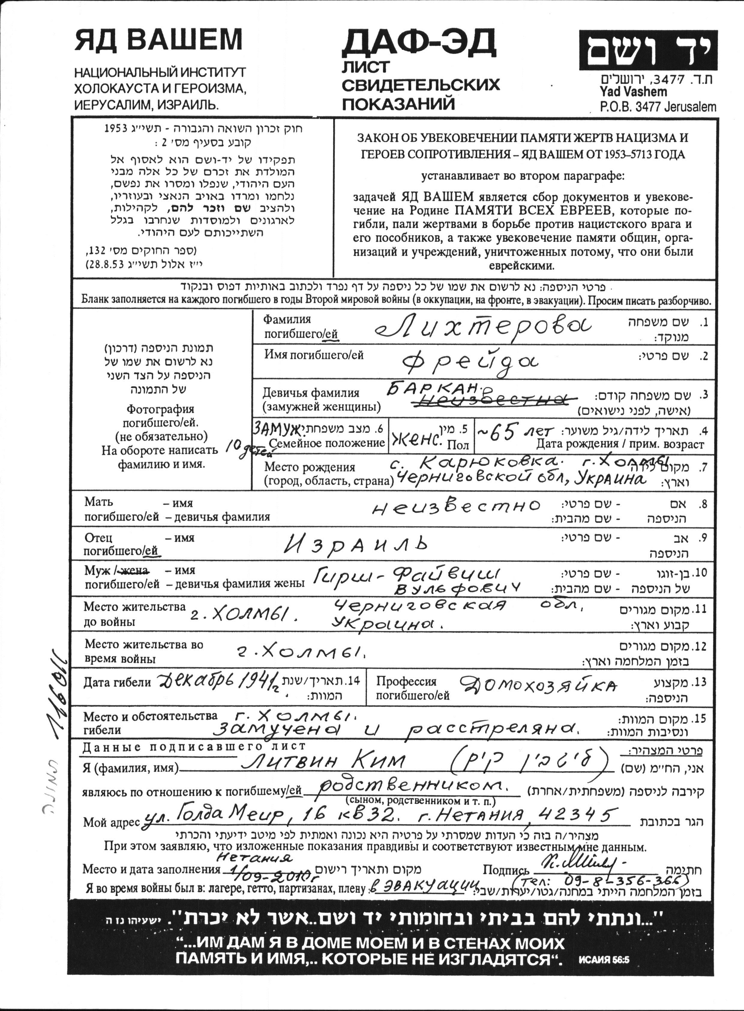 Freyda Likhterova nee Barkan was born in Kholmy, Ukraine (USSR), 1876. She was a housewife. Prior to WWII she lived in Kholmy, Ukraine (USSR). Freyda was murdered in the Shoah. Place of death: Kholmy, Ukraine (USSR), 12/1941.