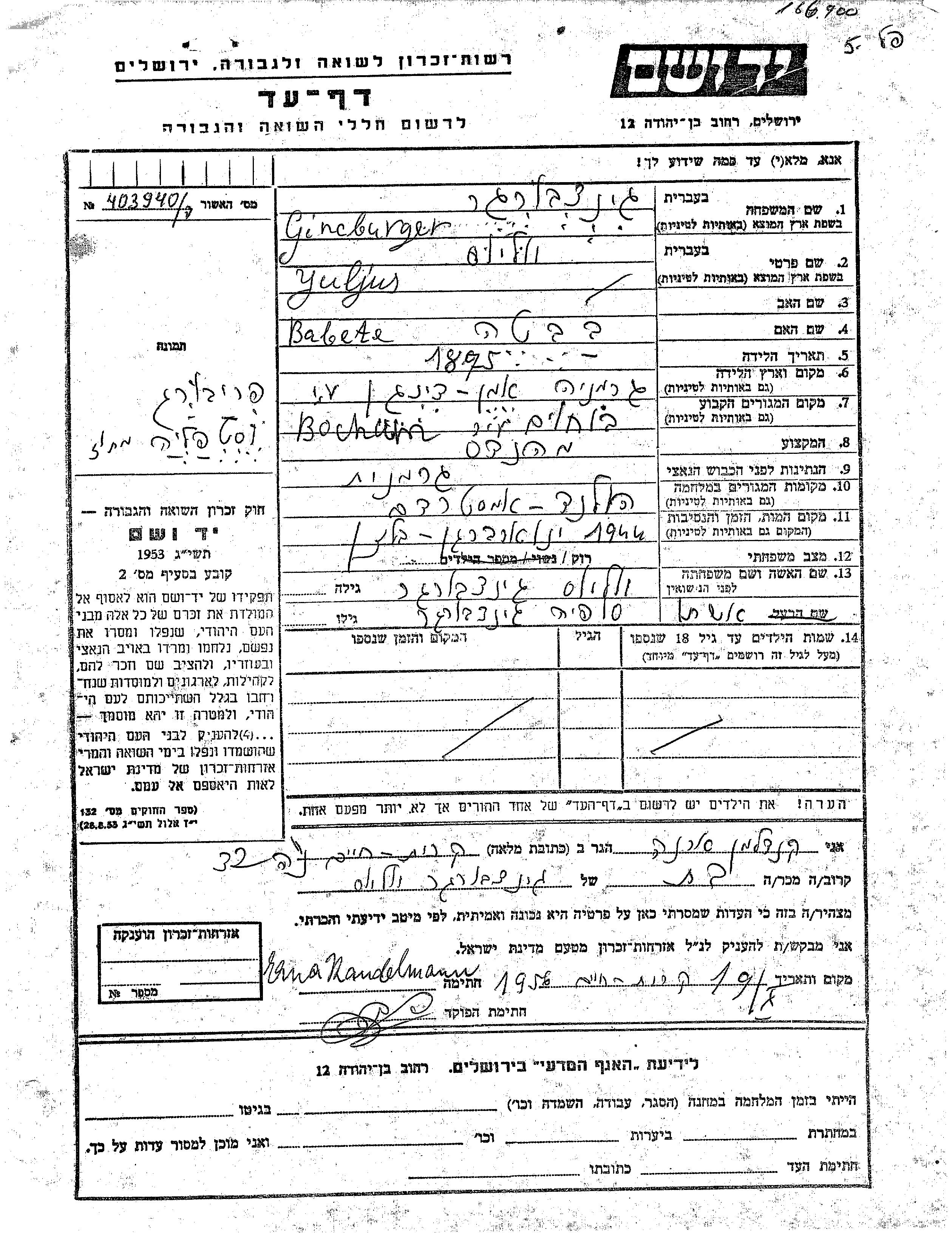 Gincburger Yuljus 1875 Gerthe Bochum, Germany Page of Testimony