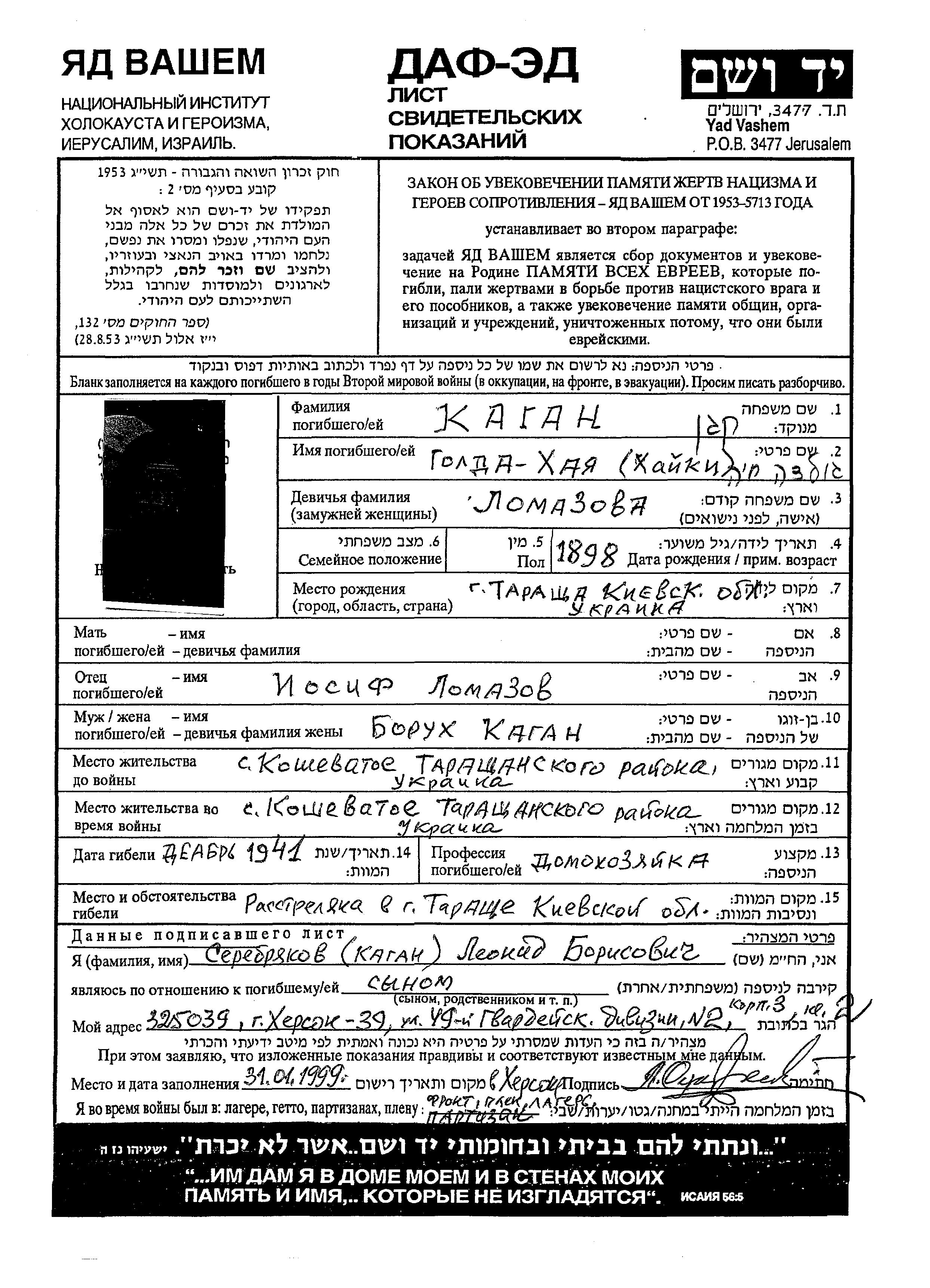 Kagan | Khaia Golda | 1898 | Koshevatoye, Ukraine (USSR) | Page of Testimony |