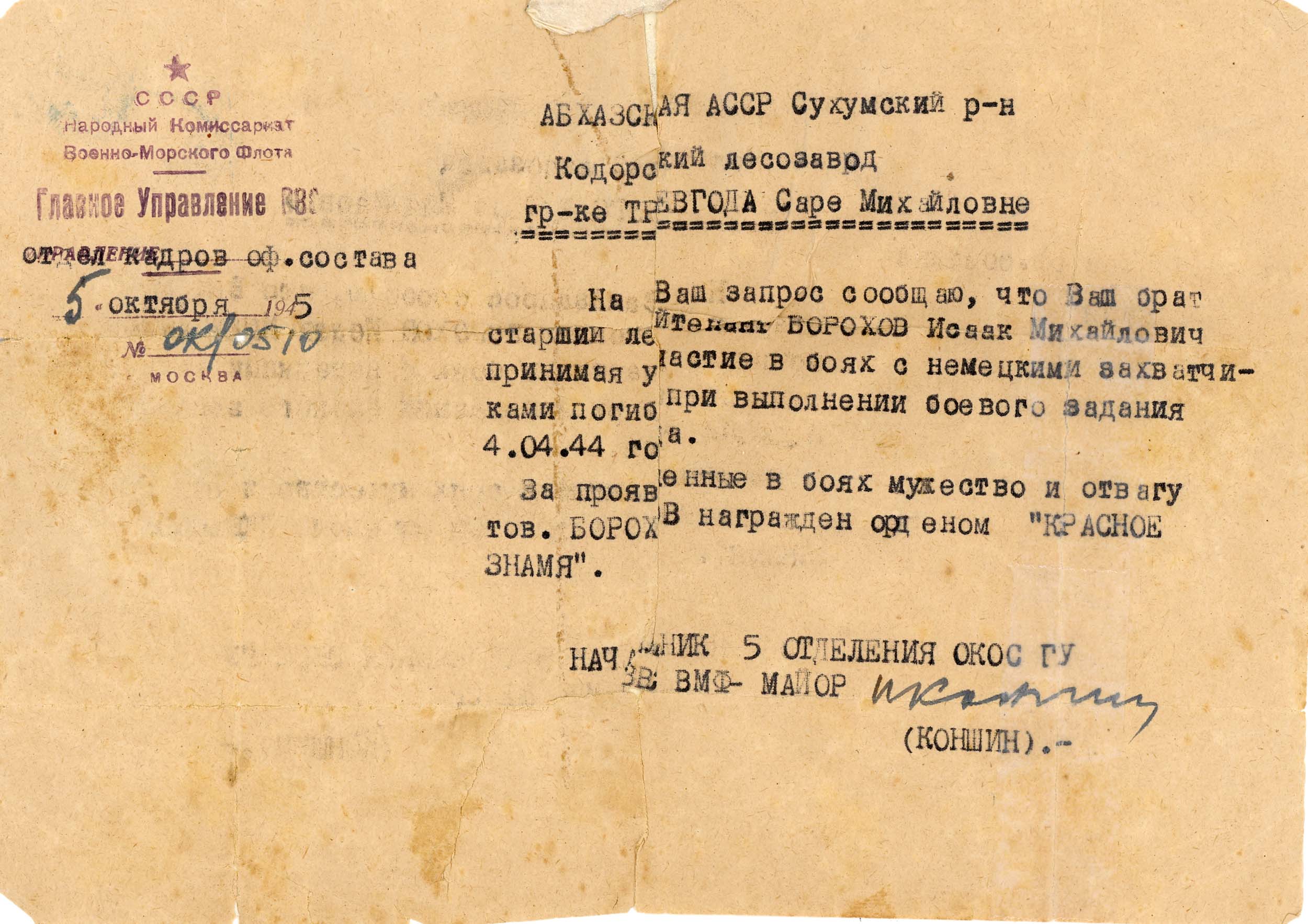 Isaak Borokhov was born in Novorossiysk, Russia (USSR), 1917. He was an ofitzer voyenno morskogo flota. Prior to WWII he lived in Novorossiysk, Russia (USSR). Isaak was killed in military service in WWII. Place of death: Leningrad, Russia (USSR), 04/04/1944.