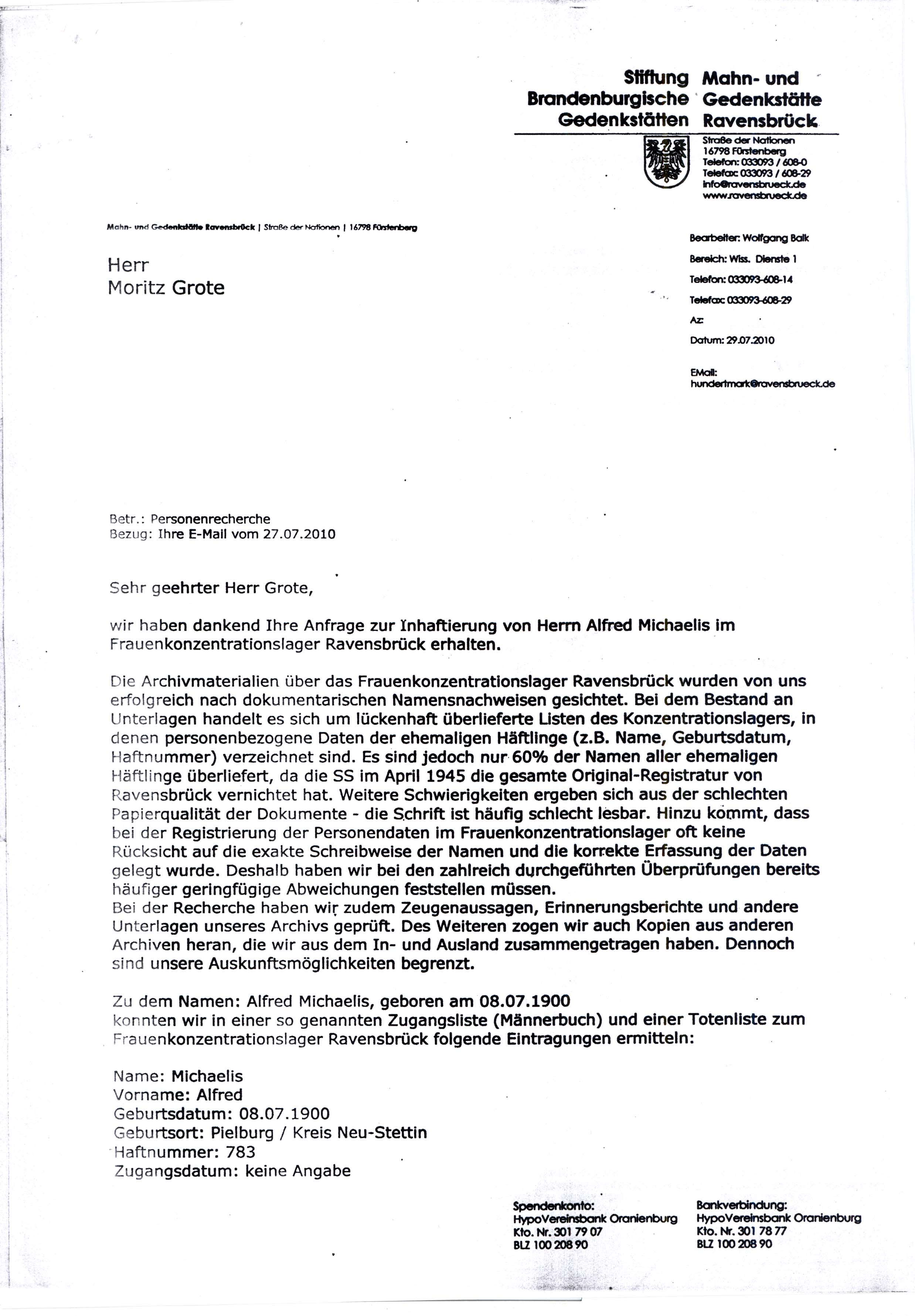 | Michaelis | Alfred | unstated place, | Personal documents | |