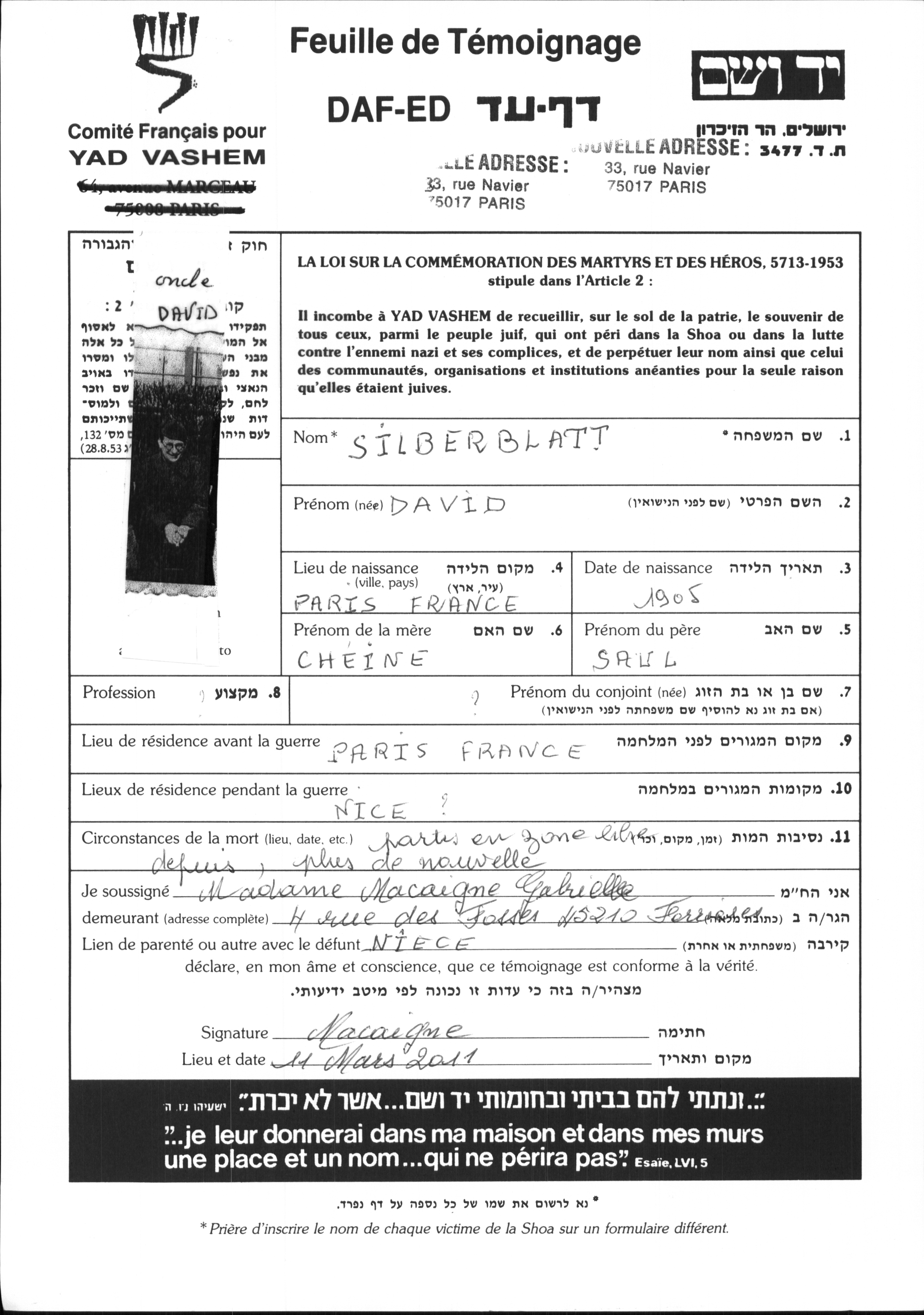 David Silberblatt was born in Paris, France, 1905. Prior to WWII he lived in Paris, France.