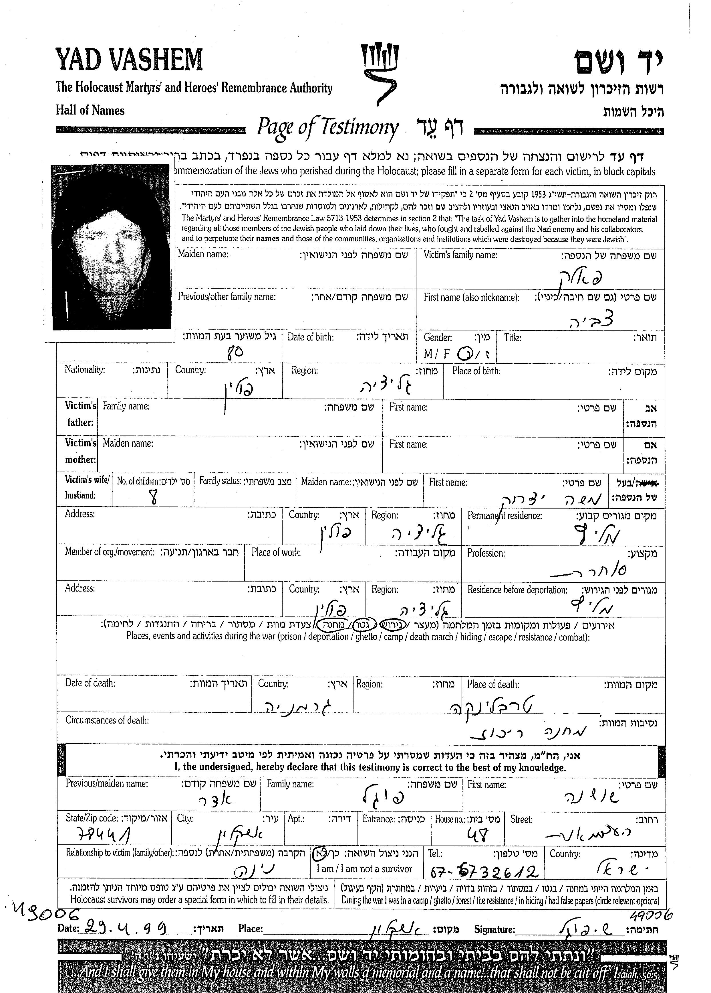 Yad Vashem - Pages of Testimony Names Memorial Collection
