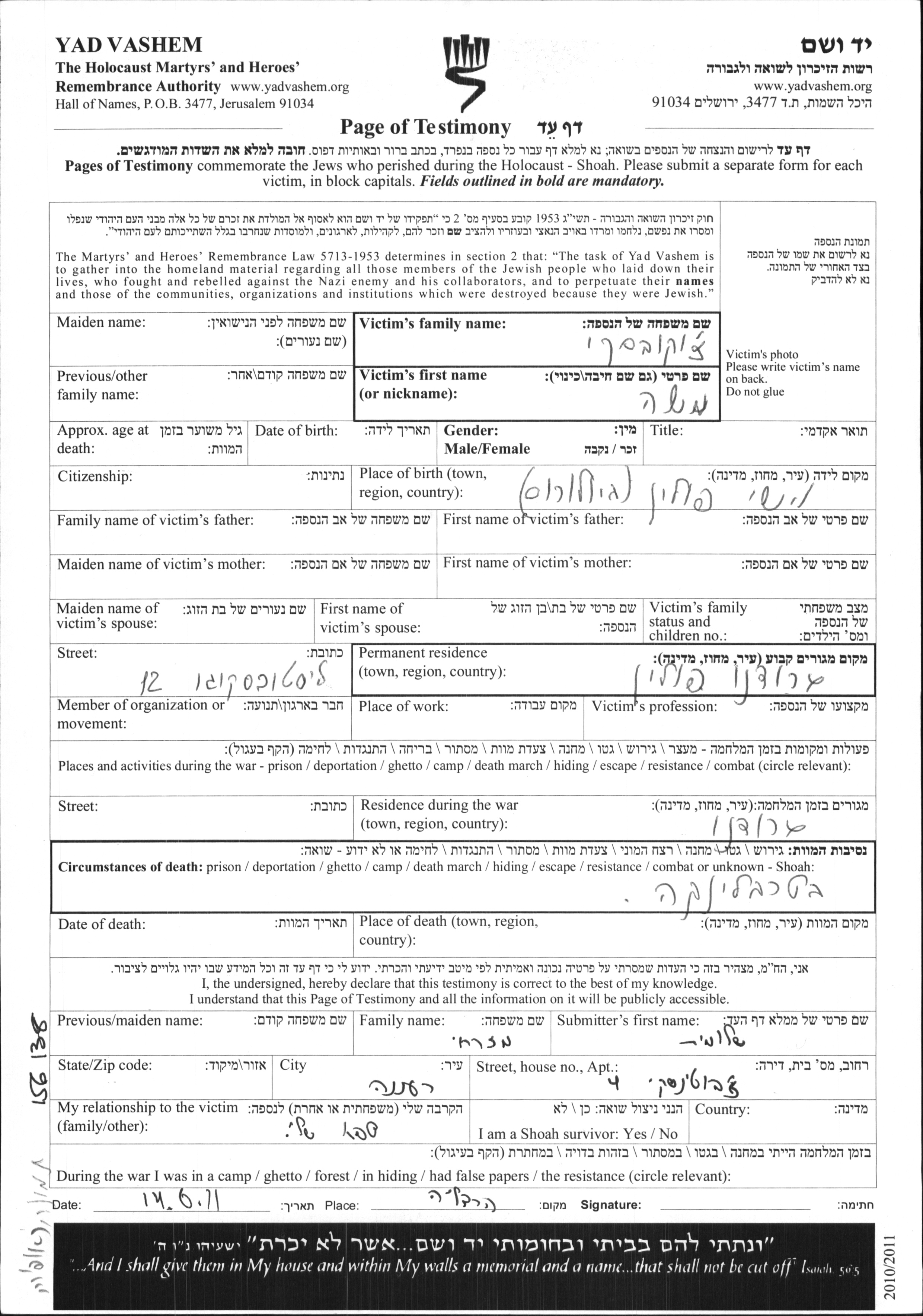Yad Vashem - Pages of Testimony Names Memorial Collection