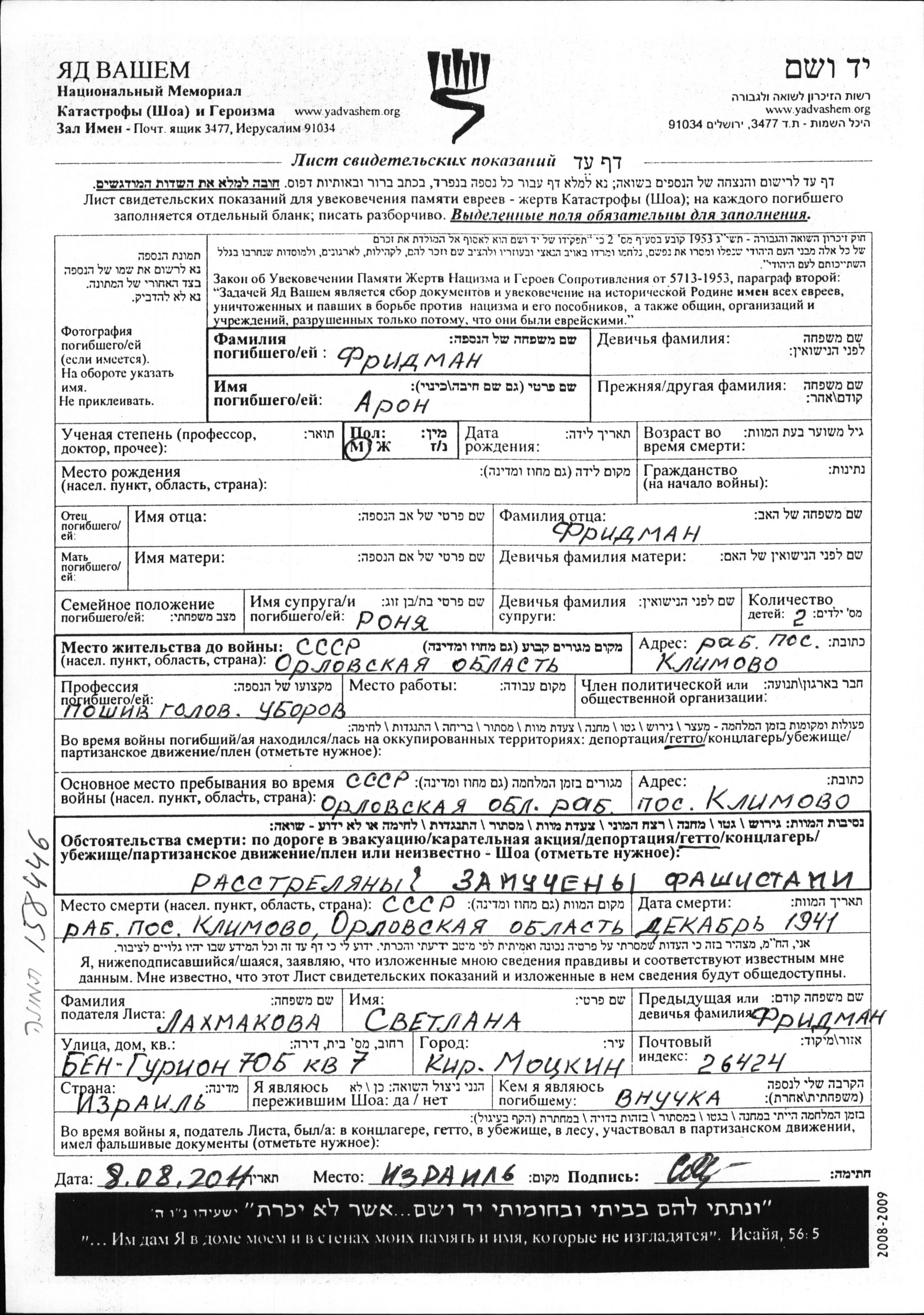 Fridman Aron Klimovo, Russia (USSR) Page of Testimony