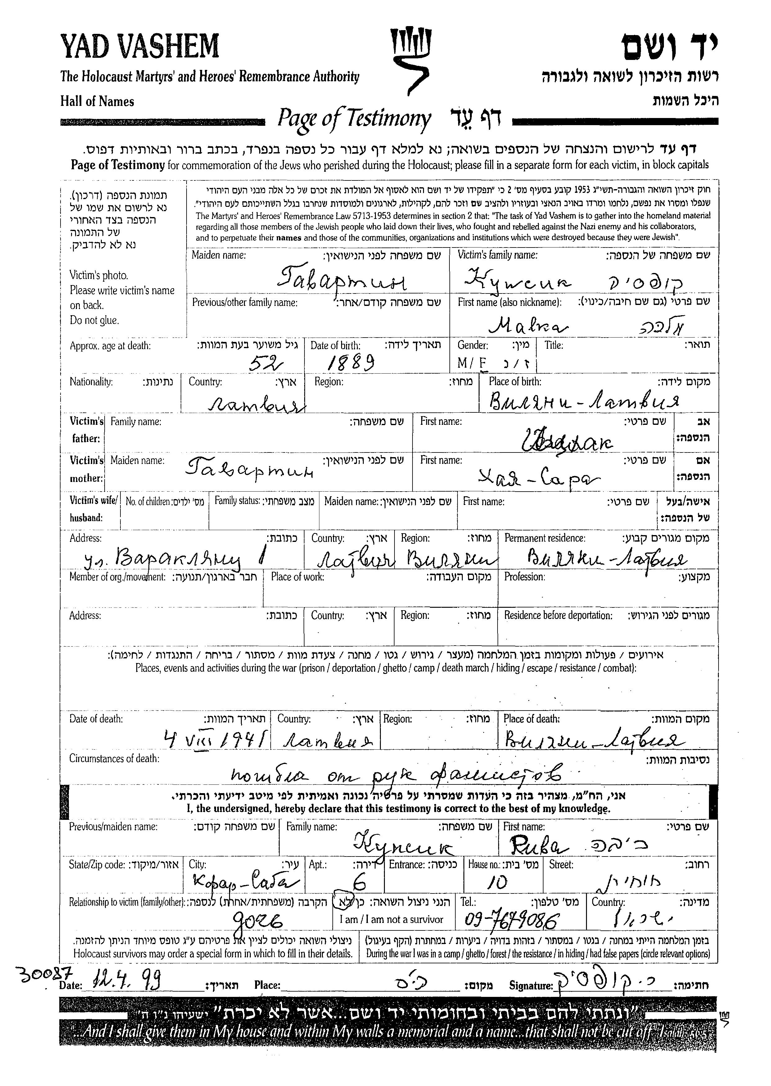 Yad Vashem - Pages of Testimony Names Memorial Collection