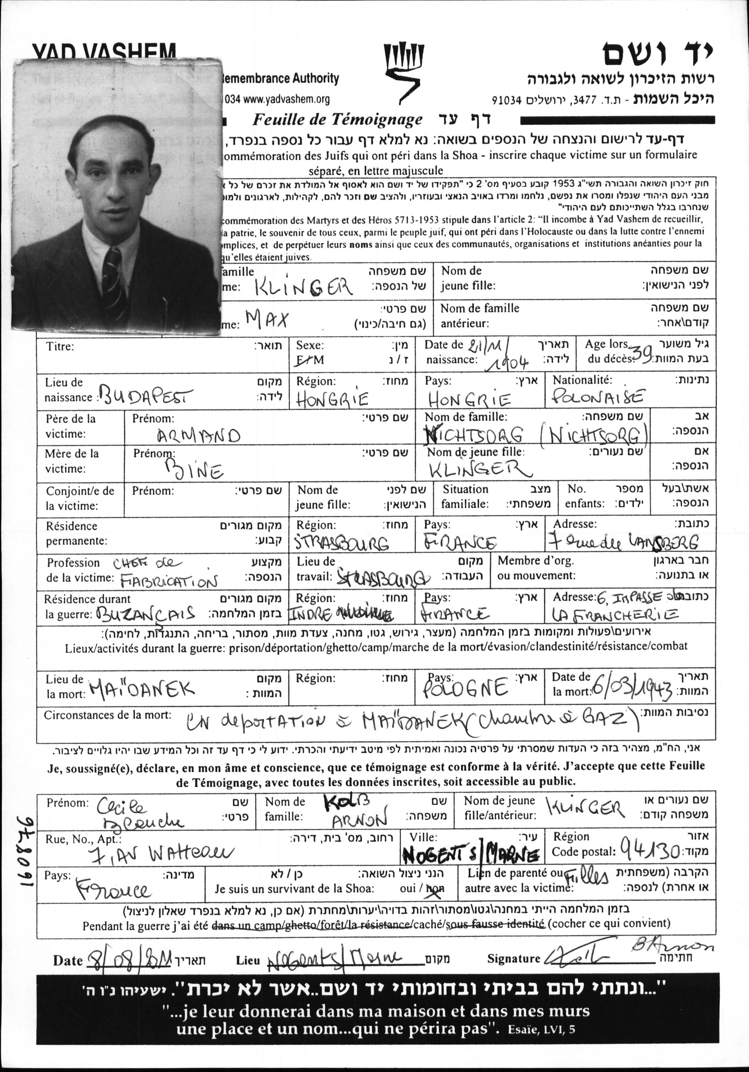 Max Klinger was born in Budapest, Hungary, 1904. He was a factory foreman. Prior to WWII he lived in Strasbourg, France.