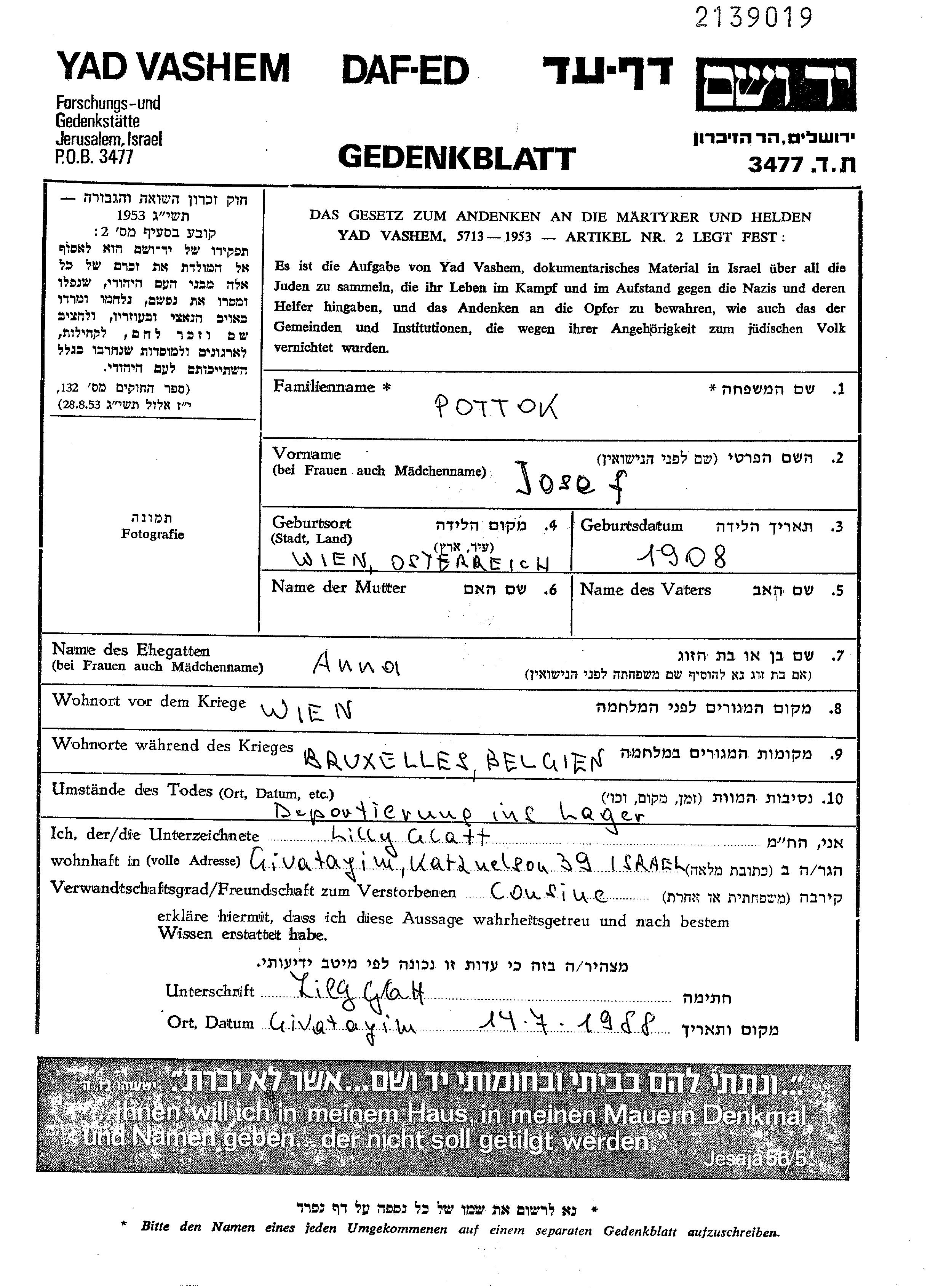 Pottok Josef 1908 Wien, Austria Page of Testimony