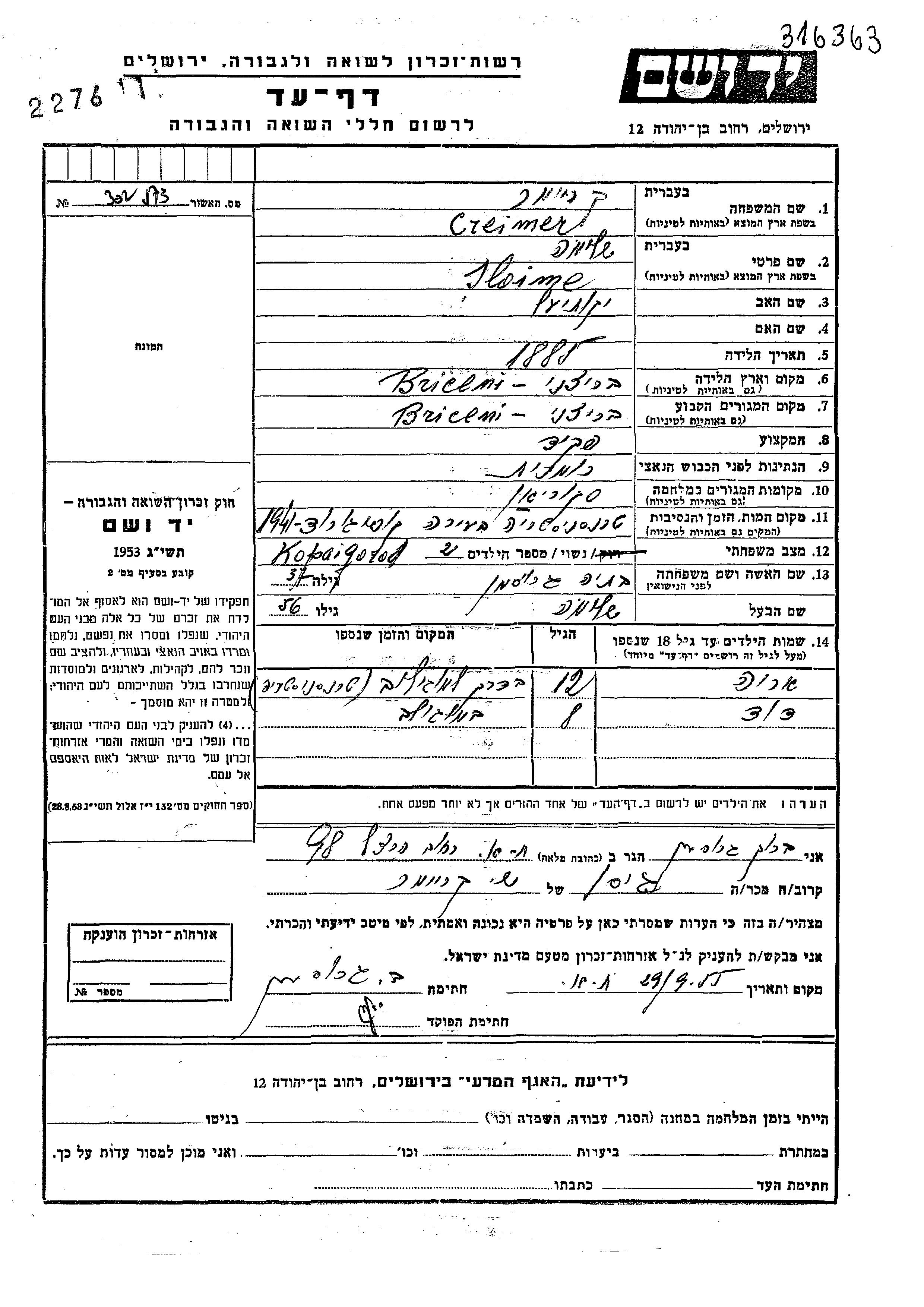| Creimer | Arie | Briceni, Romania | Page of Testimony | |
