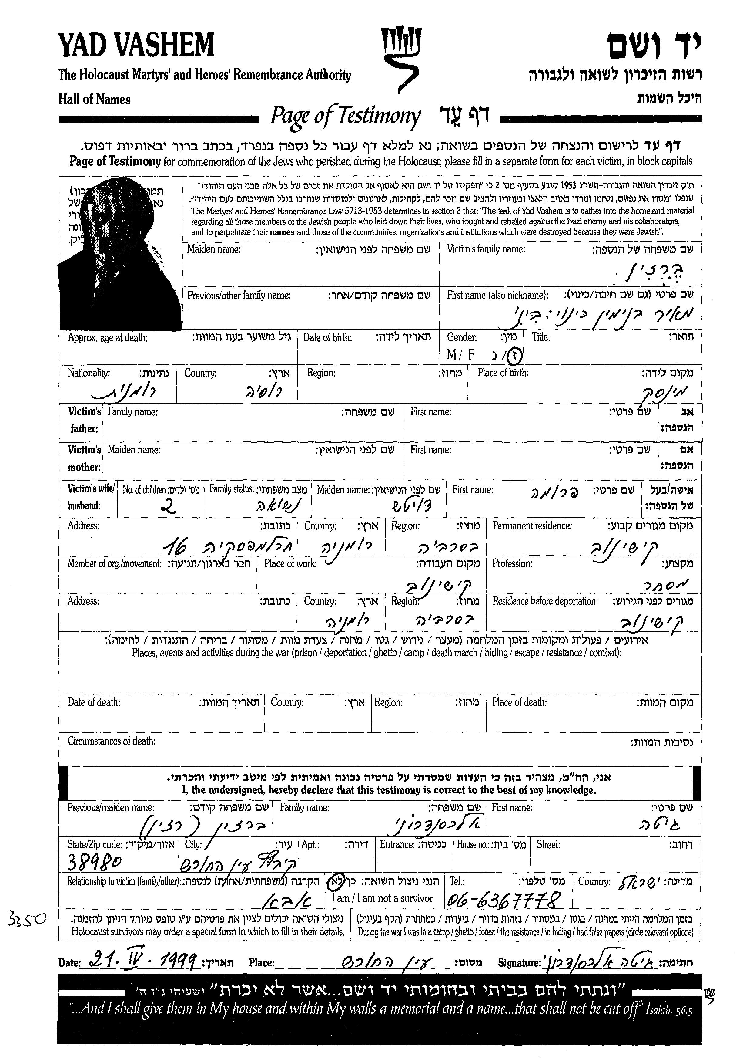 | Berezin | Meir Beniamin Biny | Kiszinow, Romania | Page of Testimony | |
