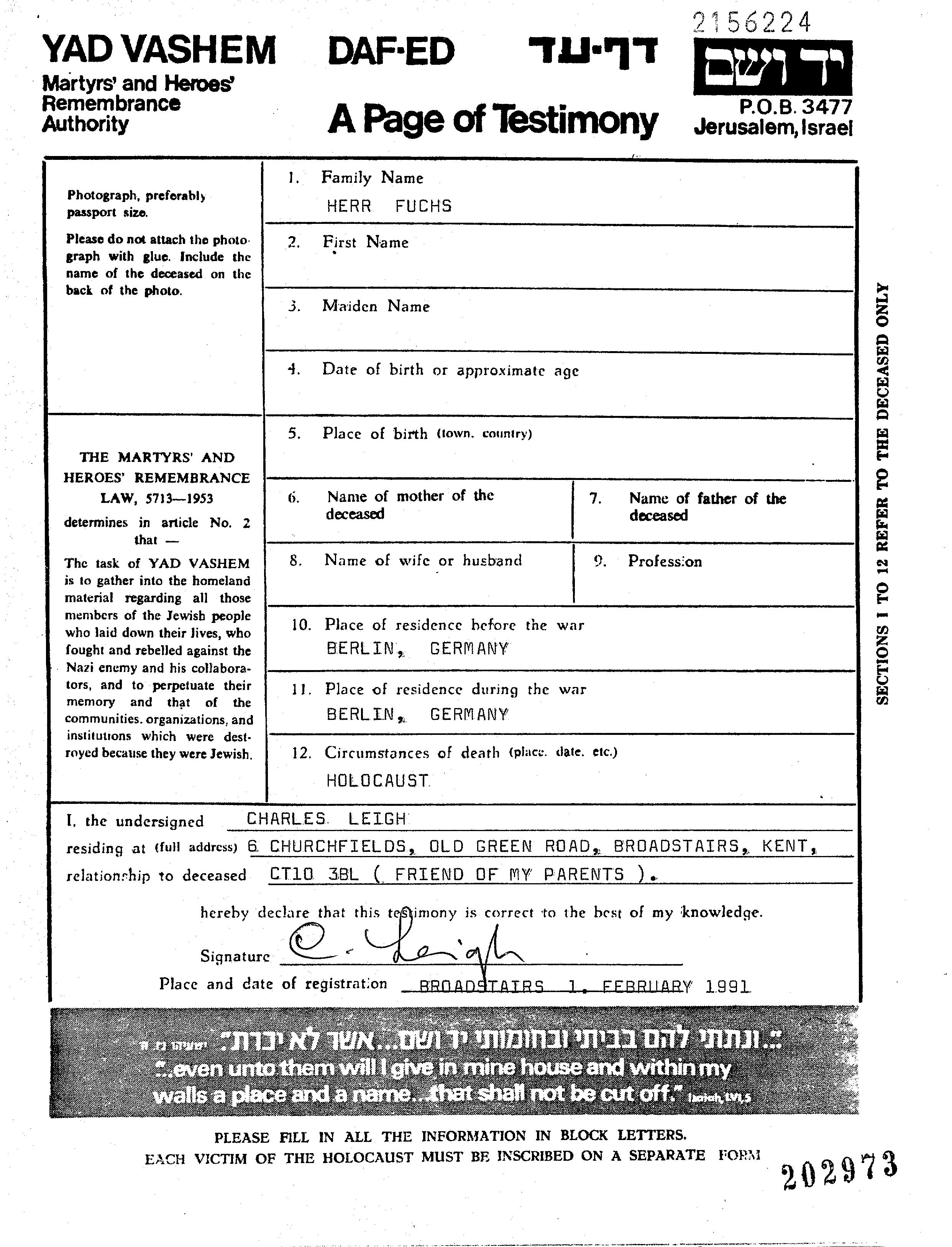 Fuchs First name unknown Berlin, Germany Page of Testimony
