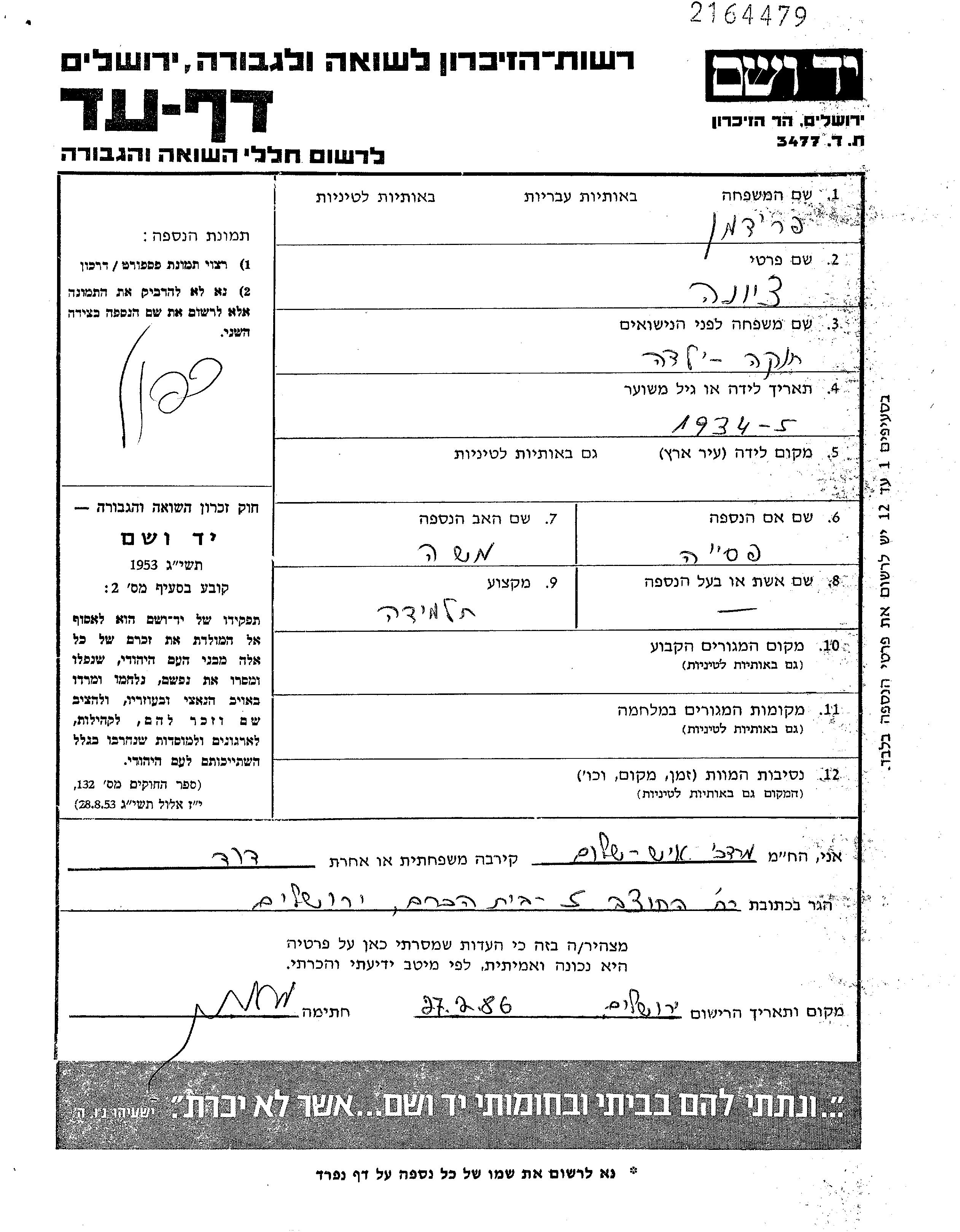 Fridman Ziona 1934 unstated place, Page of Testimony