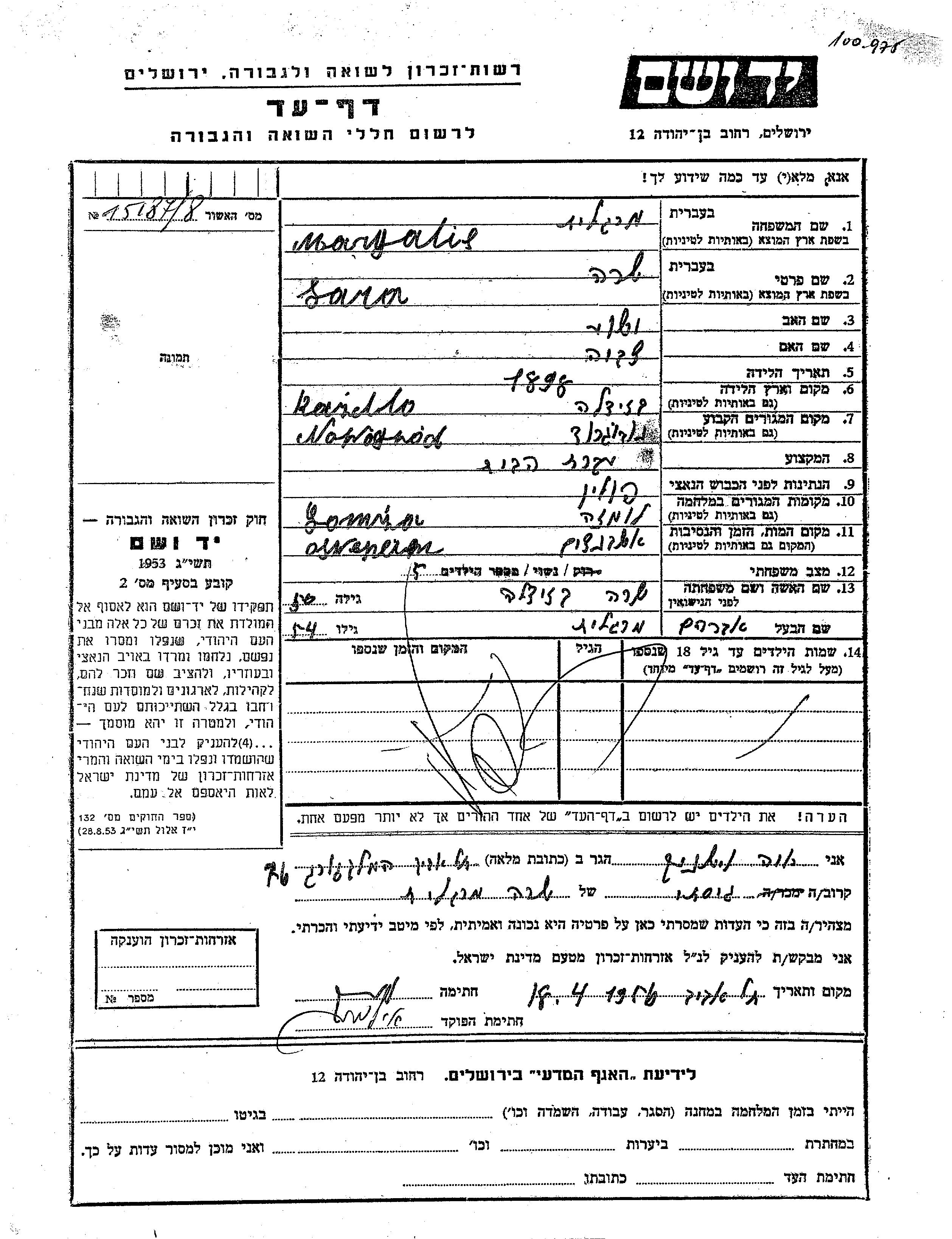 Sara Margalit nee Kazidla was born in Kadzidlo, Poland, 1898 to Yeshua and Tzvia. She was a housewife and married to Avraham. Prior to WWII she lived in Nowogrod, Poland. During the war she was in Łomża, Poland. Sara was murdered in the Shoah. Place of death: Auschwitz, Poland.