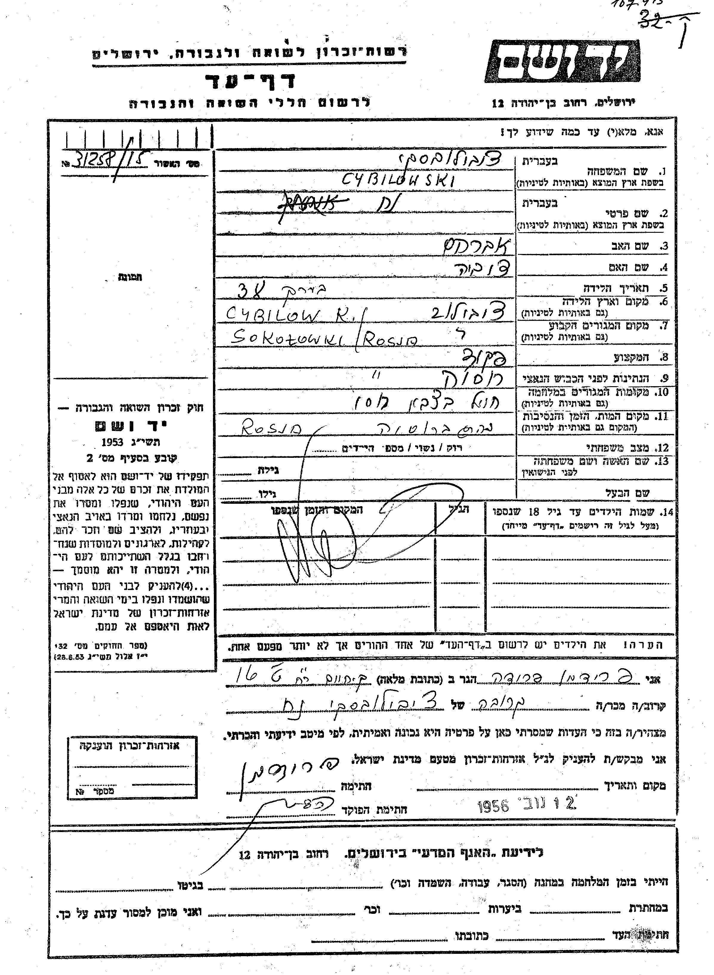 Noakh Cybilowski was born in Tsibulev, Ukraine (USSR) to Avraham and Dobia. He was a clerk. Prior to WWII he lived in Tsibulev, Ukraine (USSR). Noakh was killed in military service in WWII. Place of death: the Soviet armed forces.