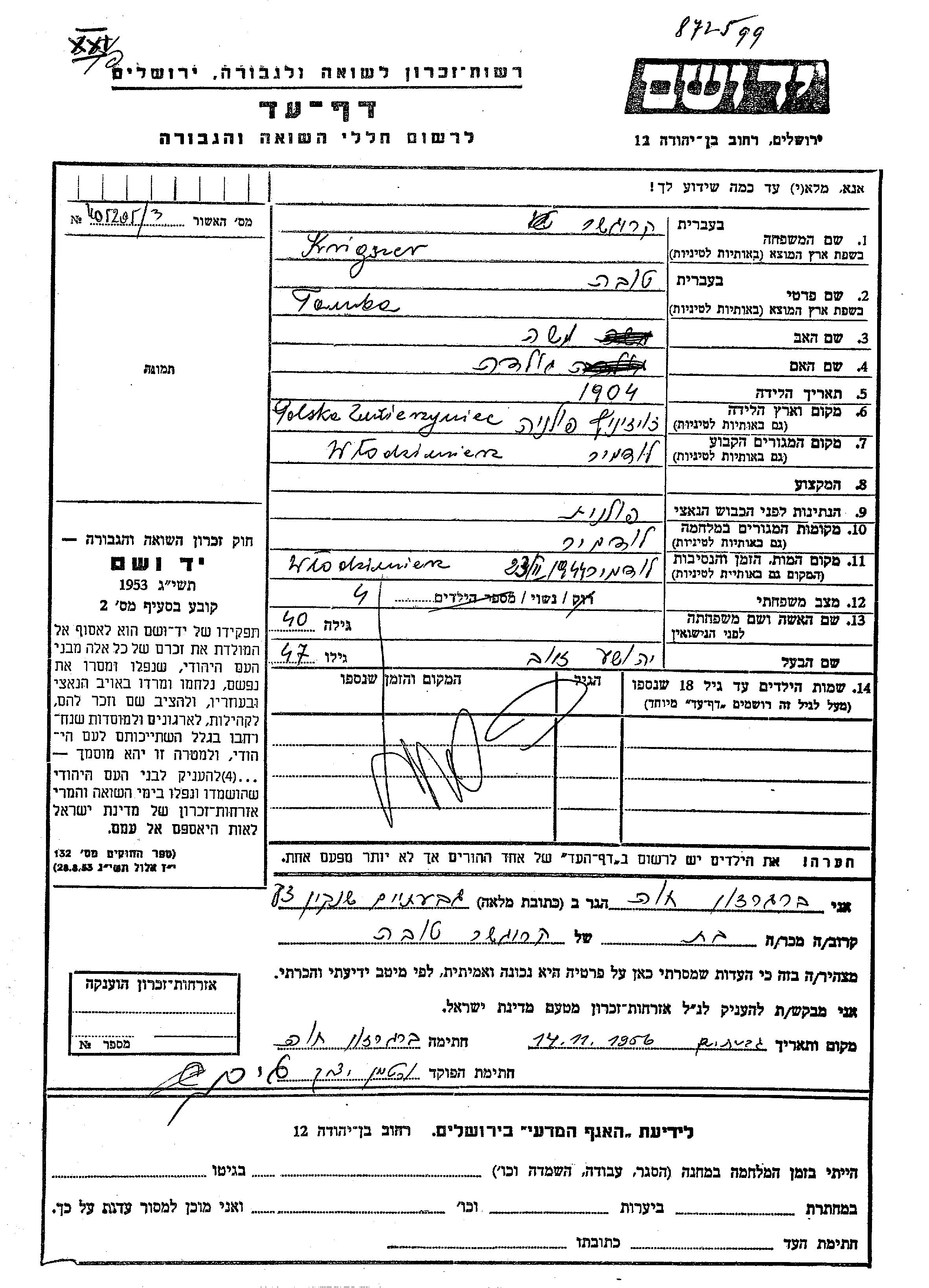 Tauba Tova Krigszer was born in Zwierzyniec, Poland, 1904 to Moshe and Golda. She was married to Yehoshua Zeev. Prior to WWII she lived in Wlodzimierz, Poland. During the war she was in Wlodzimierz, Poland. Tauba Tova was murdered in the Shoah. Place of death: Wlodzimierz, Poland, 23/02/1944.