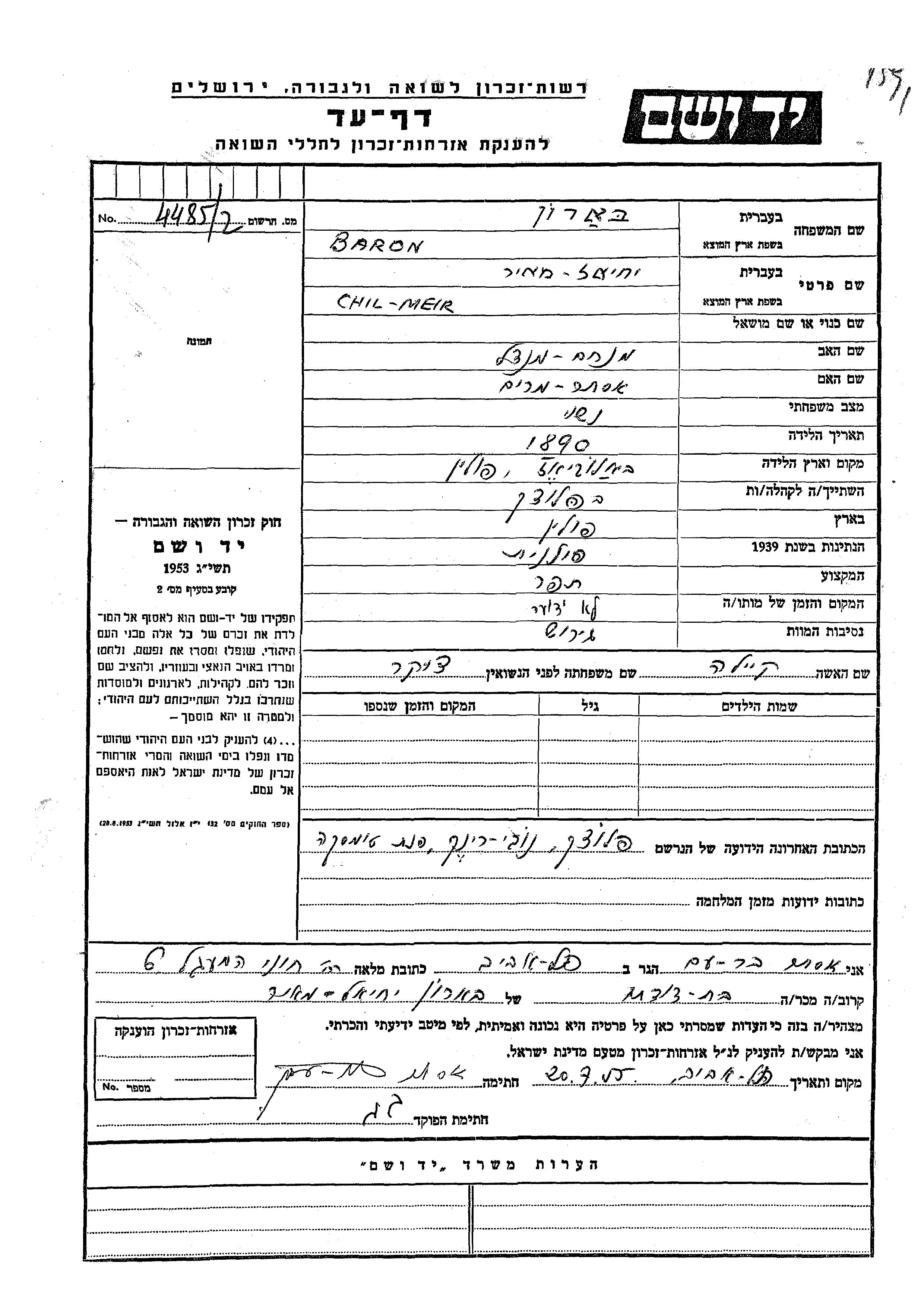Chil Meir Baron was born in Bialowieza, Poland, 1890 to Menakhem Mendel and Ester Miriam. He was an uppers cutter/tailor and married to Keila nee Tzuker. Prior to WWII he lived in Plock, Poland. Chil Meir was murdered in the Shoah.