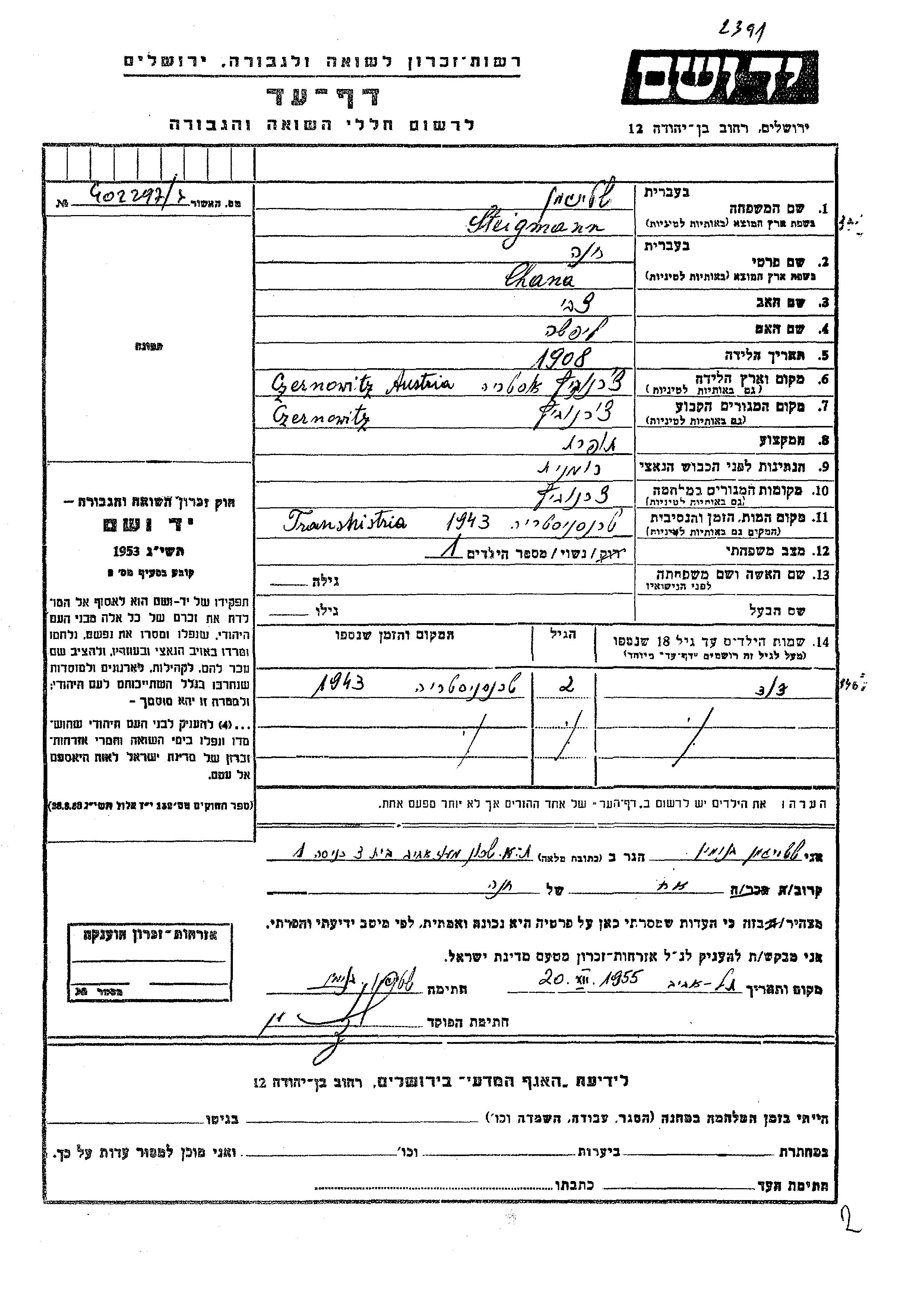 Chana Steigmann was born in Czernowitz, Romania, 1908 to Tzvi and Lifsha. She was a seamstress and married. Prior to WWII she lived in Czernowitz, Romania. During the war she was in Czernowitz, Romania. Chana was murdered in the Shoah. Place of death: Transnistria, Ukraine (USSR), 1943.
