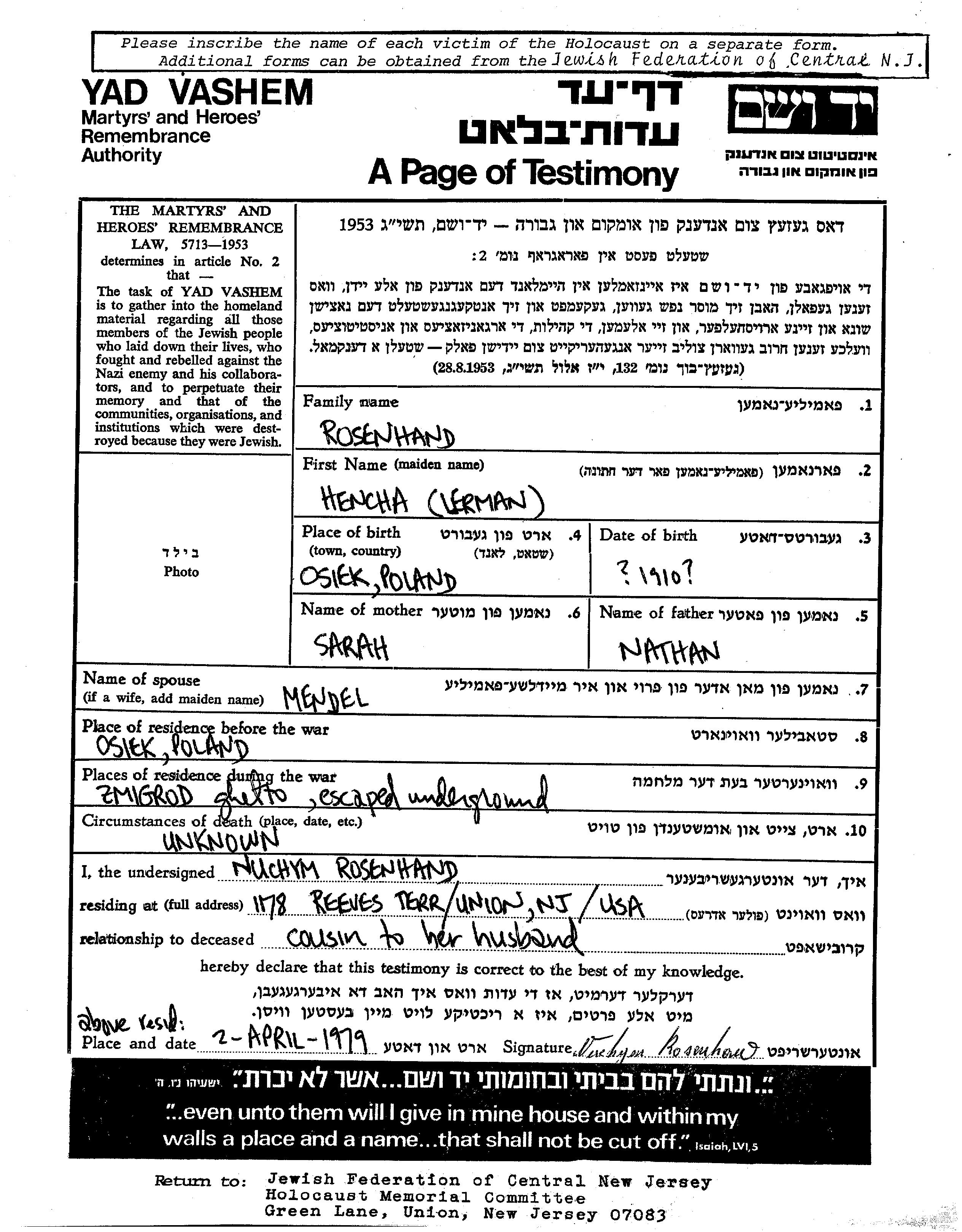 Hencha Rosenhand nee Lerman was born in Osiek, Poland, 1910 to Nathan and Sarah. She was married to Mendel. Prior to WWII she lived in Osiek, Poland. During the war she was in Zmigrod Nowy, Poland. Hencha was murdered in the Shoah.