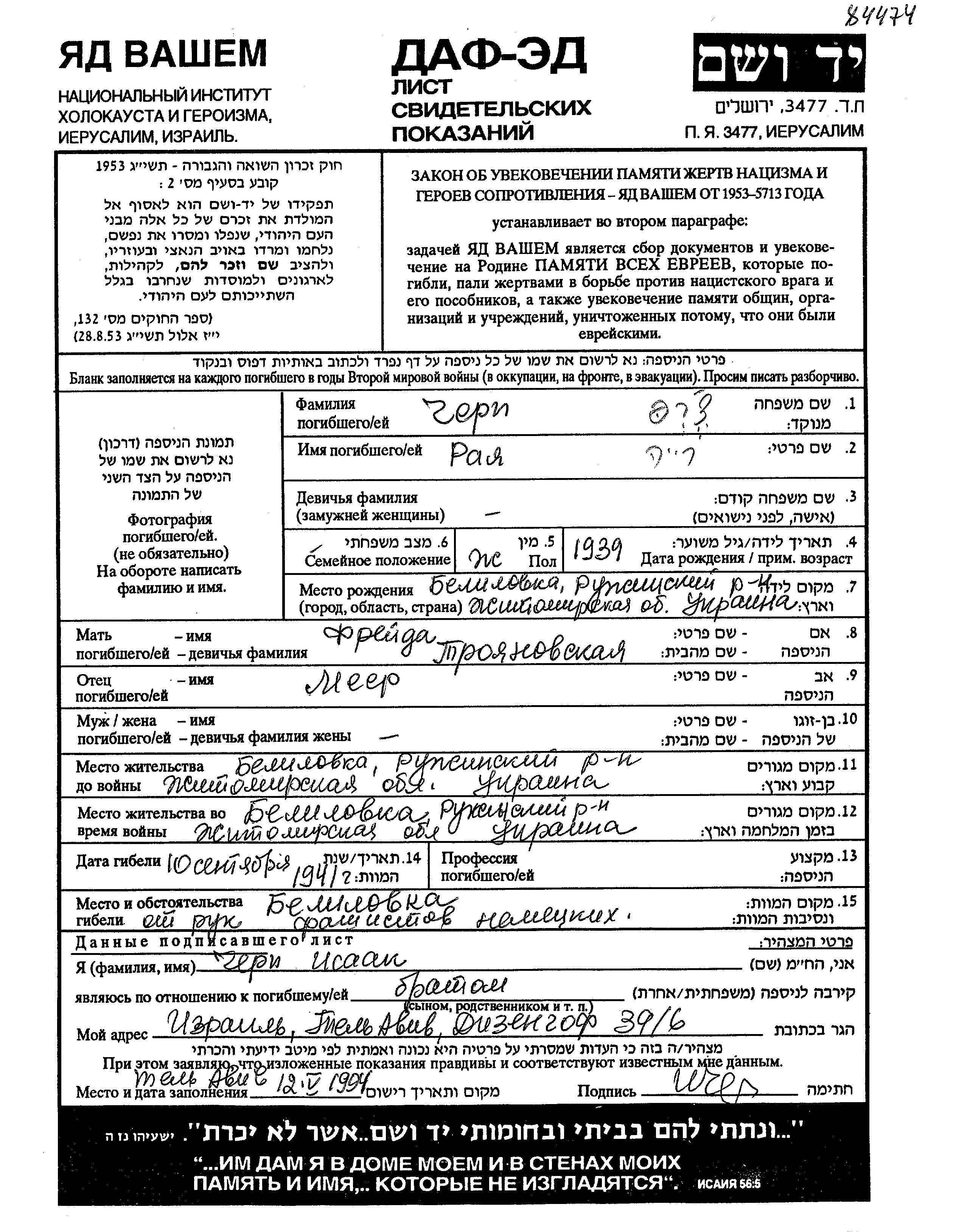 Cherp Raya 1939 Belilovka, Ukraine (USSR) Page of Testimony