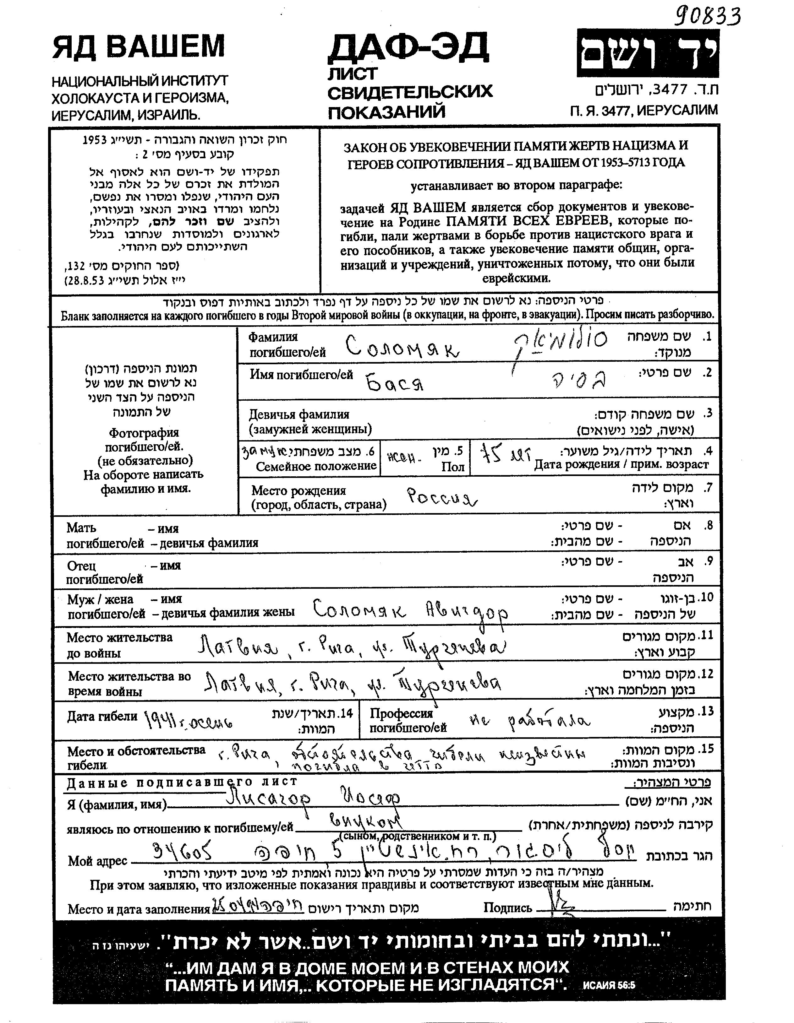 Basia Solomyak was born in Russia (USSR), 1866. She was married to Avigdor. Prior to WWII she lived in Riga, Latvia. During the war she was in Riga, Latvia. Basia was murdered in the Shoah. Place of death: Riga, Latvia, 1941.
