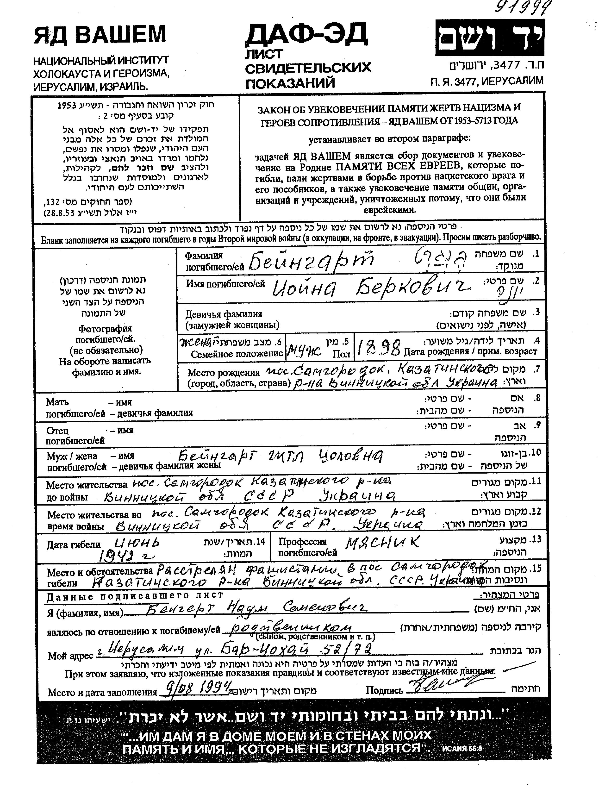 Ioyna Beingart was born in Samgorodok, Ukraine (USSR), 1898 to Berko. He was a butcher and married to Gitl. Prior to WWII he lived in Samgorodok, Ukraine (USSR). During the war he was in Samgorodok, Ukraine (USSR). Ioyna was murdered in the Shoah. Place of death: Samgorodok, Ukraine (USSR), 1942.